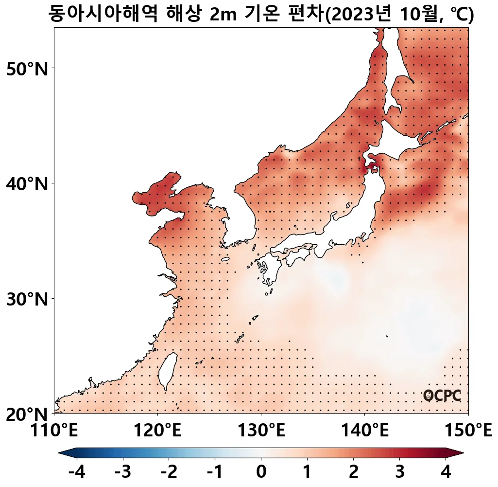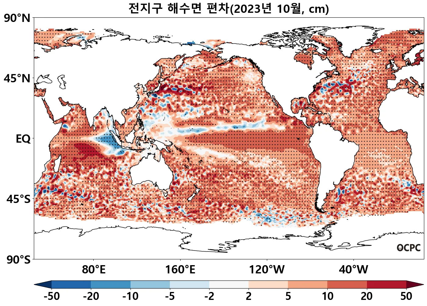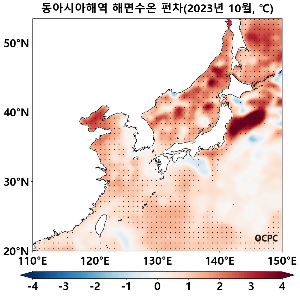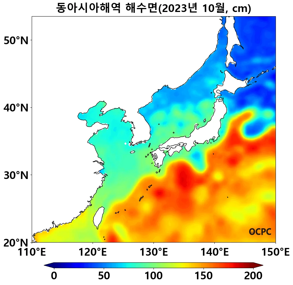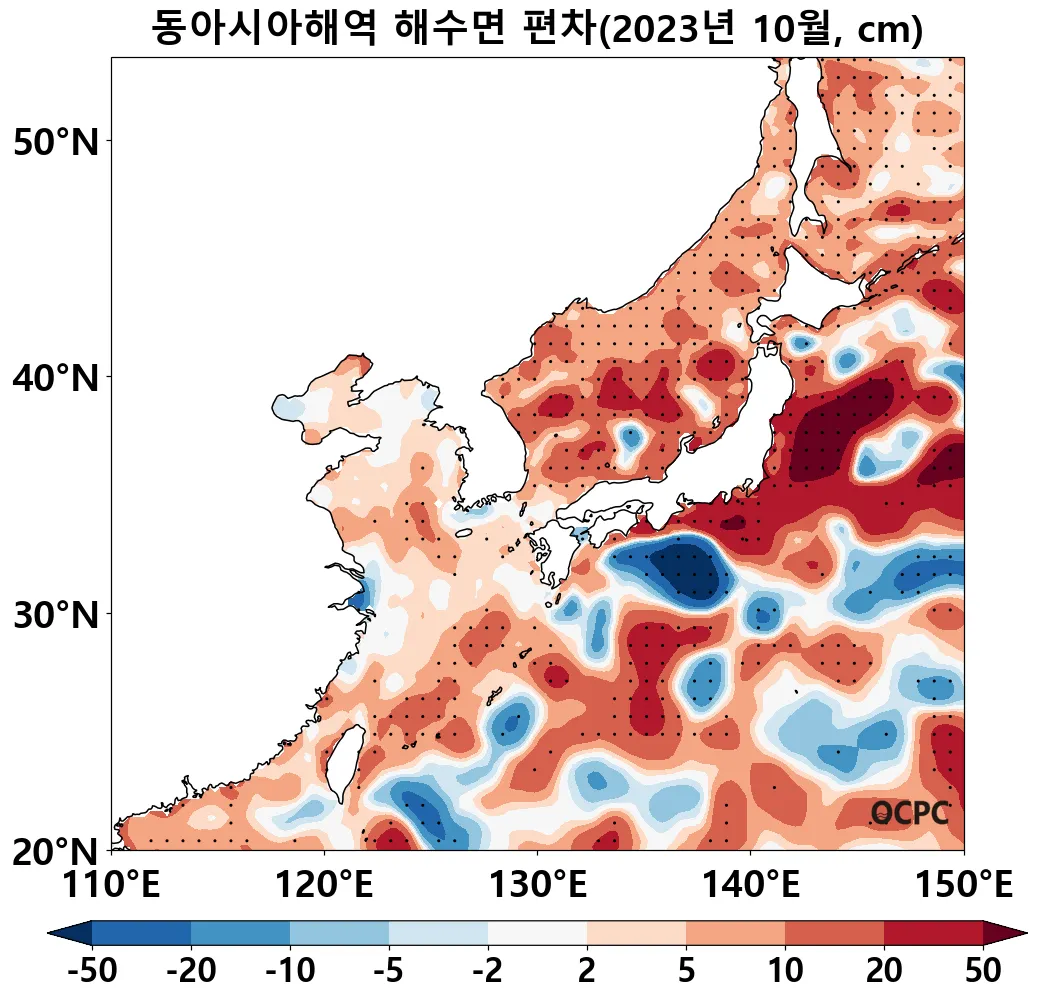 1993~2023년 동안 전지구 10월 해면수온은 10년에 0.2°C씩 증가하는 추세이며, 동아시아해역의 추세는 10년에 0.2~0.4°C로 그 중 동해의 상승률이 가장 큽니다.