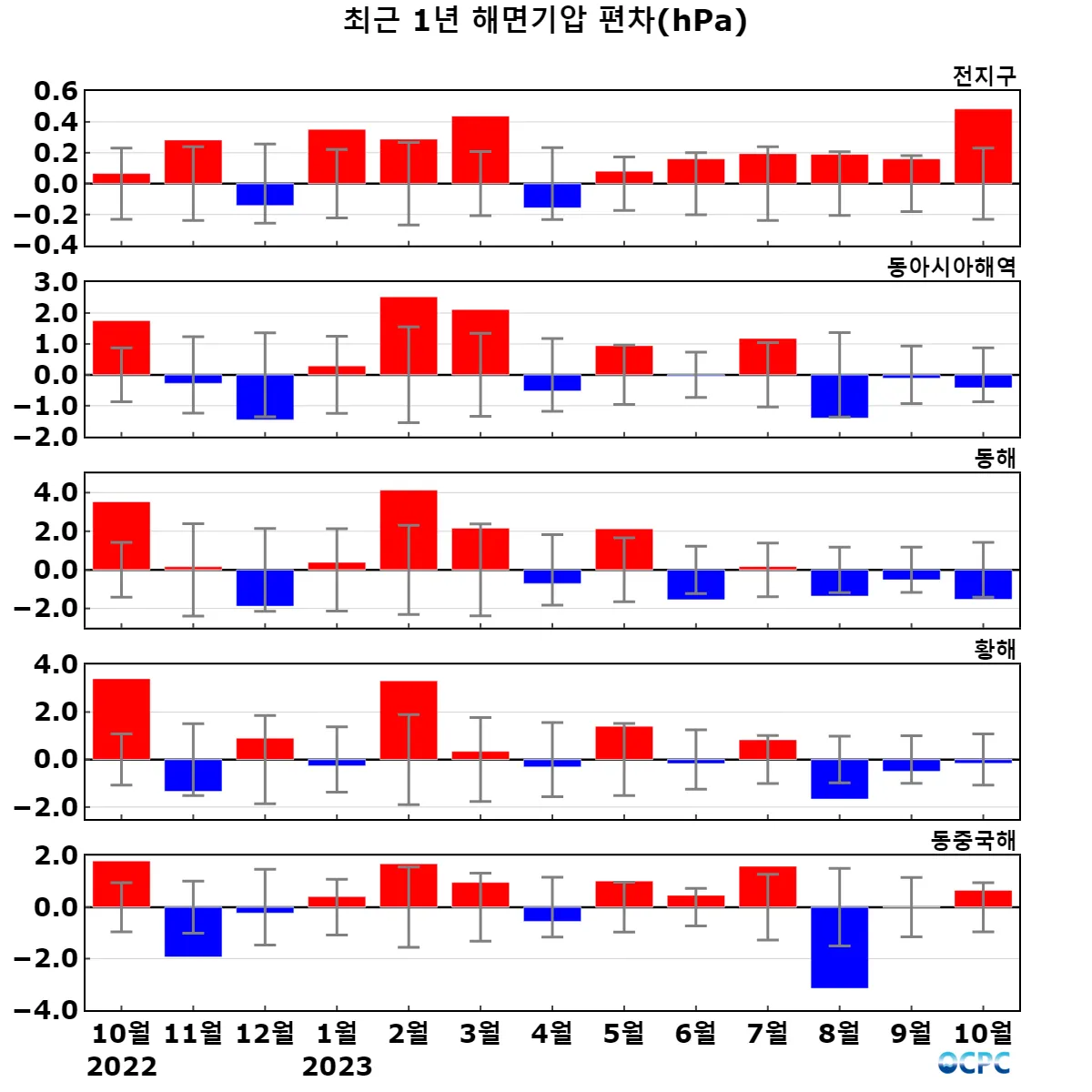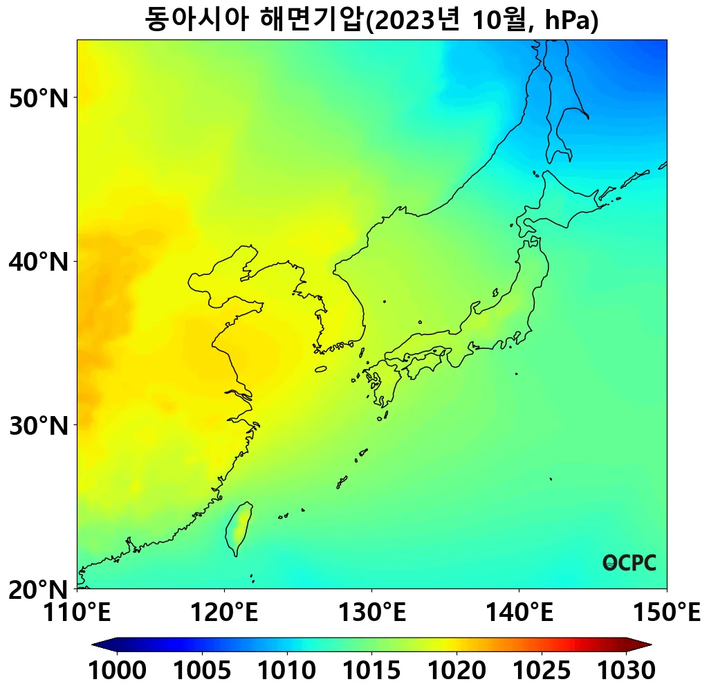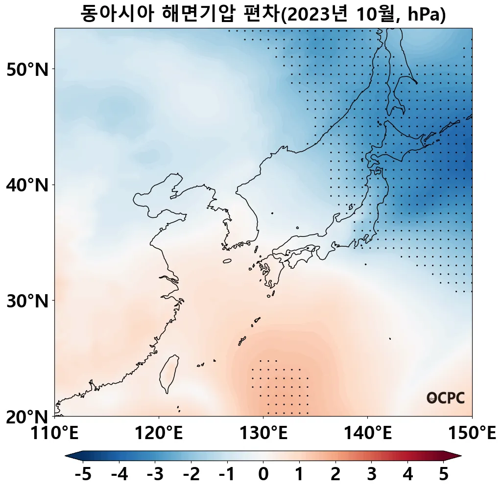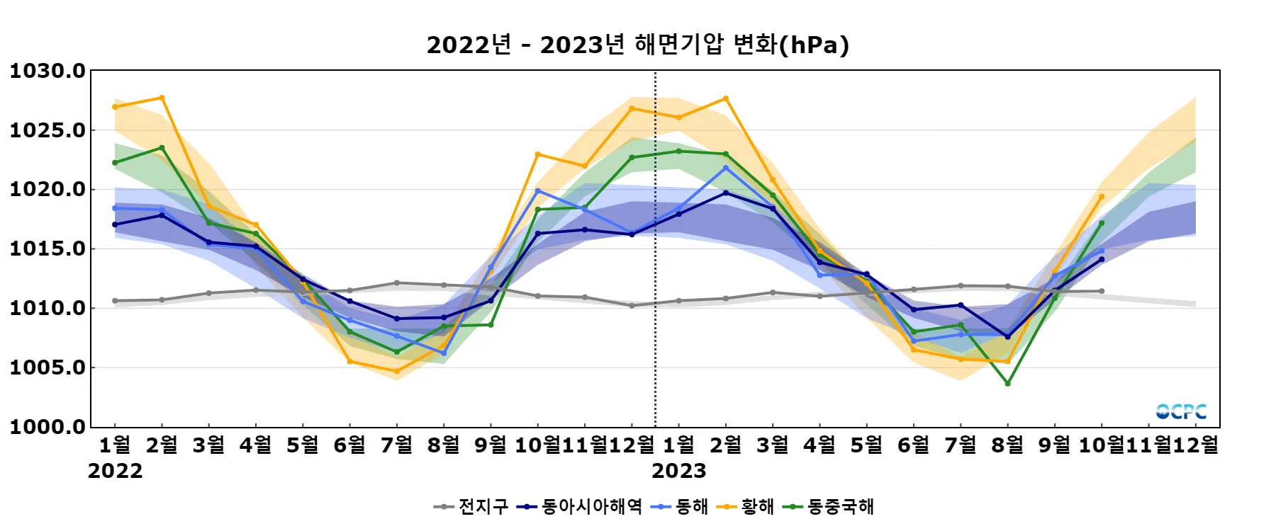 동해의 해면기압은 평년(1016.4±1.4hPa)보다 1.5hPa 낮았으며, 황해, 동중국해의 해면기압은 평년(1019.6±1.1hPa, 1016.5±1.0hPa)과 비슷했습니다.