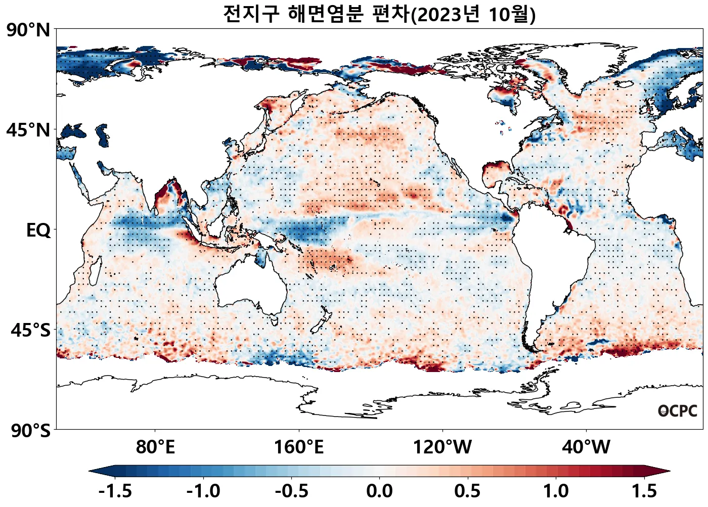 인공위성(SMAP)을 이용한 해면염분 추정 자료는 2015년 4월부터 활용가능하나 기간이 짧고 다른 자료에 비해서 불확실성이 큽니다. 2023년부터는 8년 정도의 자료가 확보되는 시점이어서 기간 평균 대비 월별 편차를 시범적으로 제공하오니 참고하시기 바랍니다.