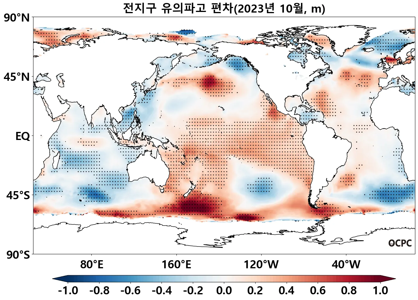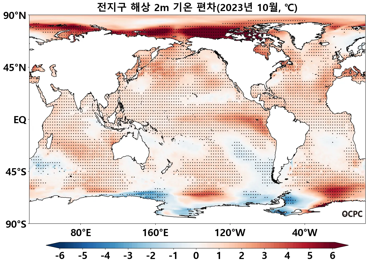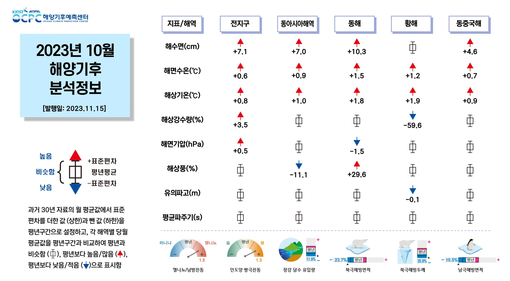 요약 : 전지구 해수면, 해면수온, 해상기온은 역대 10월 중 가장 높았으며, 열대 태평양 엘니뇨와 양의 인도양 쌍극진동이 강하게 발달했습니다. 남극 해빙 면적은 역대 10월 중 가장 작았습니다.