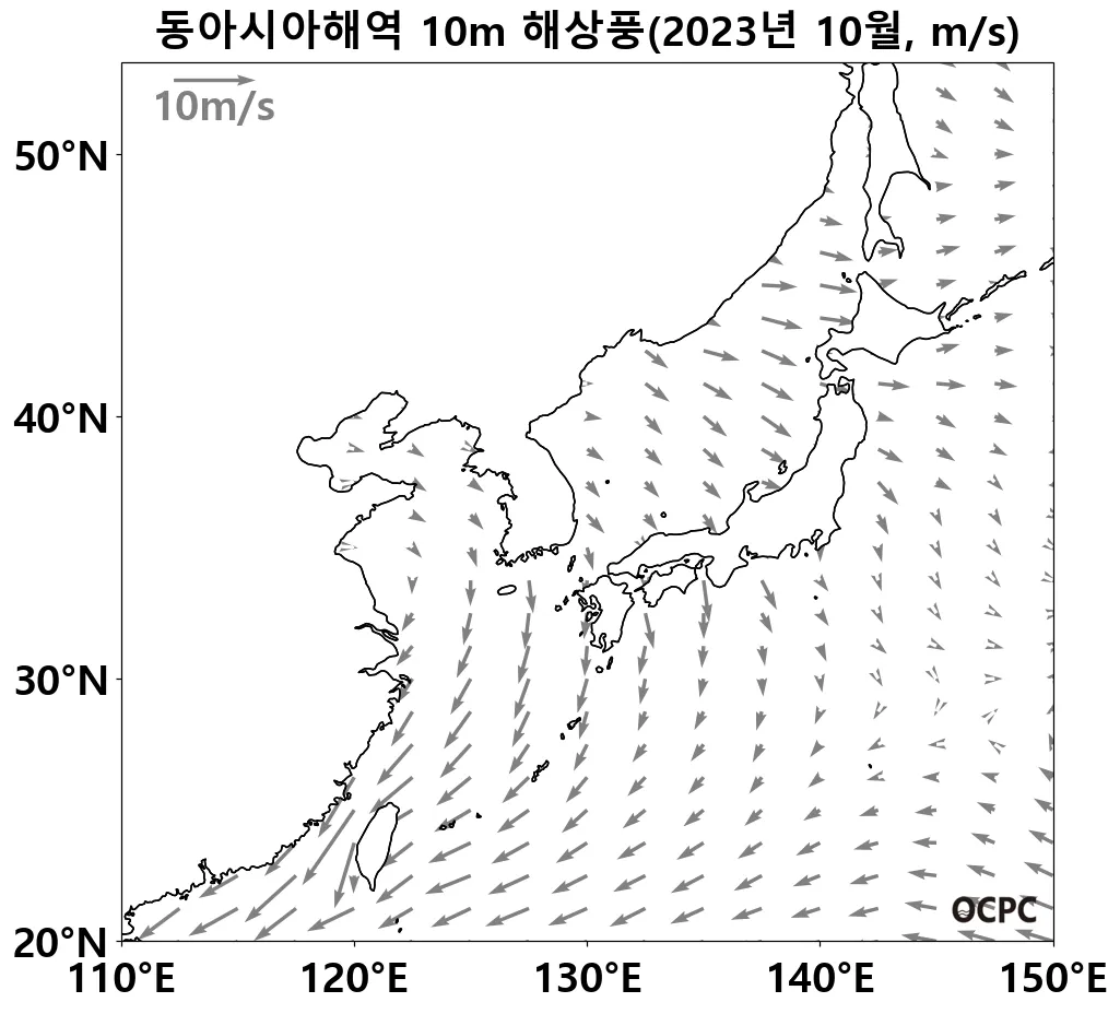 1993~2023년 동안 동아시아해역의 10월 해상풍속은 10년에 0.2~0.4m/s씩 증가하는 추세이며 그 중 동중국해의 상승율이 가장 큽니다.