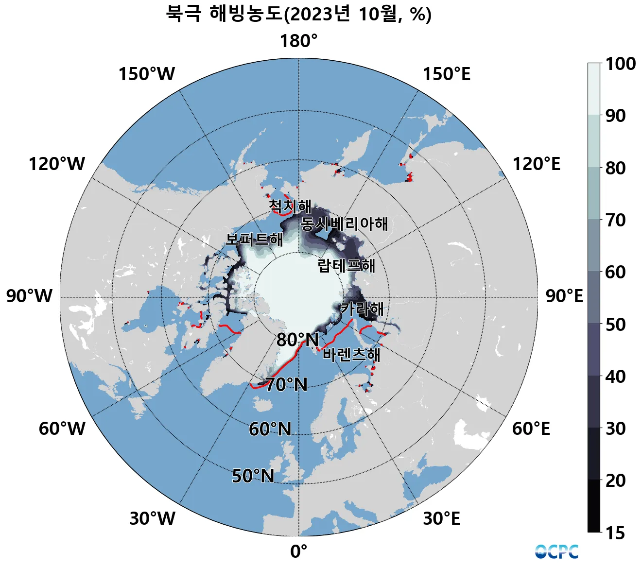 해빙농도 15% 이상 해역, 붉은선(평년 해빙농도 15% 경계)