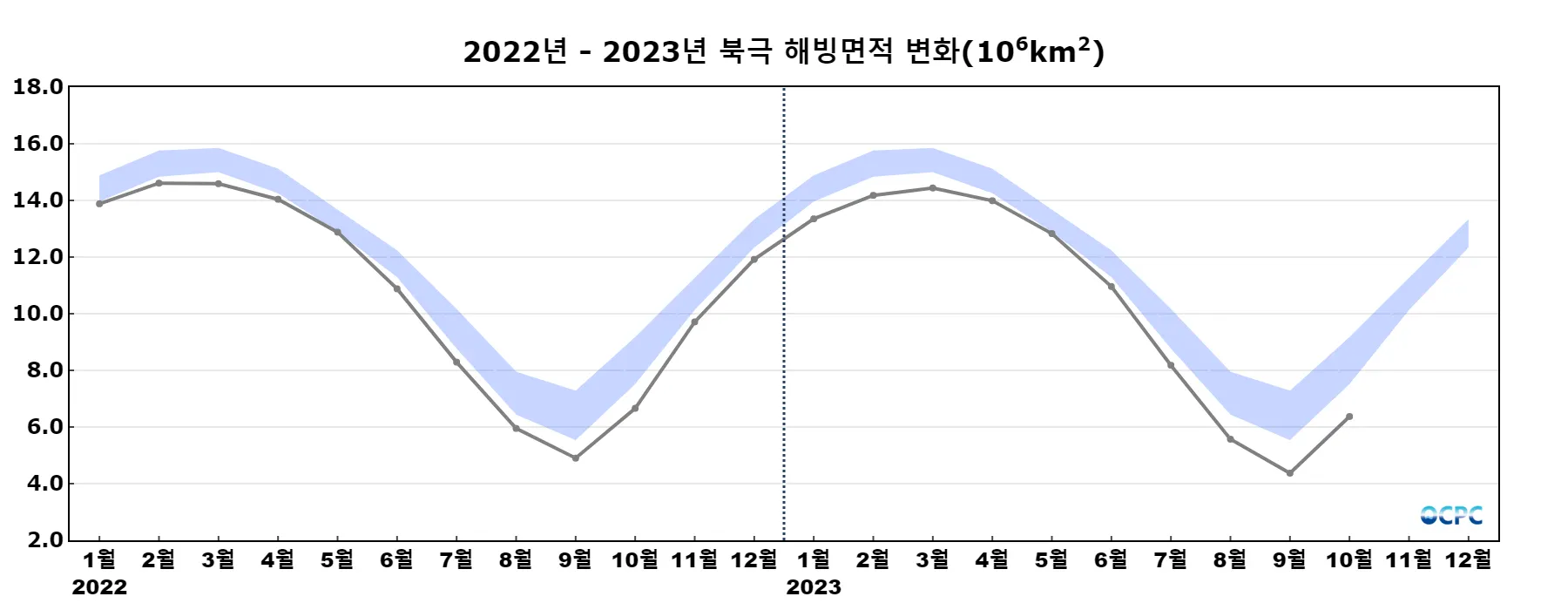 10월 북극 해빙면적은 637만km²로 평년(835만±83만km²)보다 198만km²(23.7%) 작았습니다.