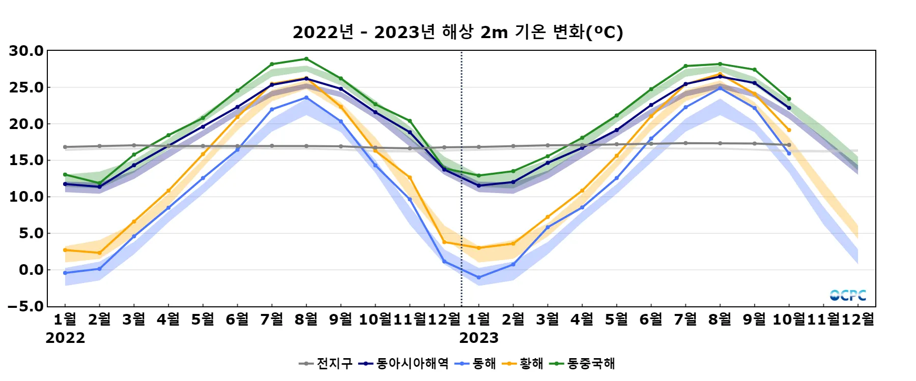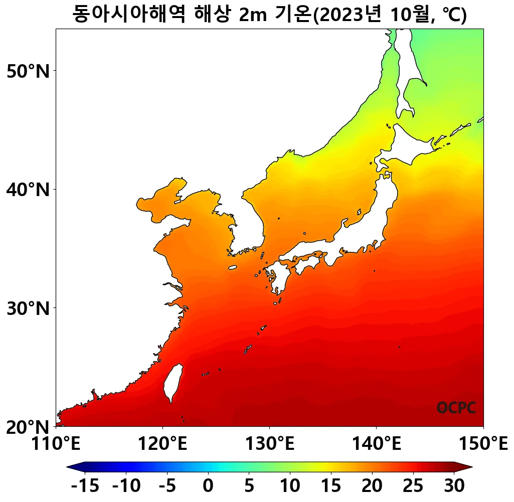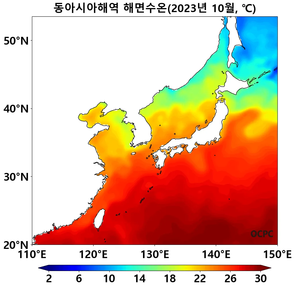 1993~2023년 동안 전지구 10월 해상기온은 10년에 0.2°C씩 증가하는 추세이며, 동아시아해역의 추세는 10년에 0.2~0.3℃로 그 중 동해의 상승률이 가장 큽니다.