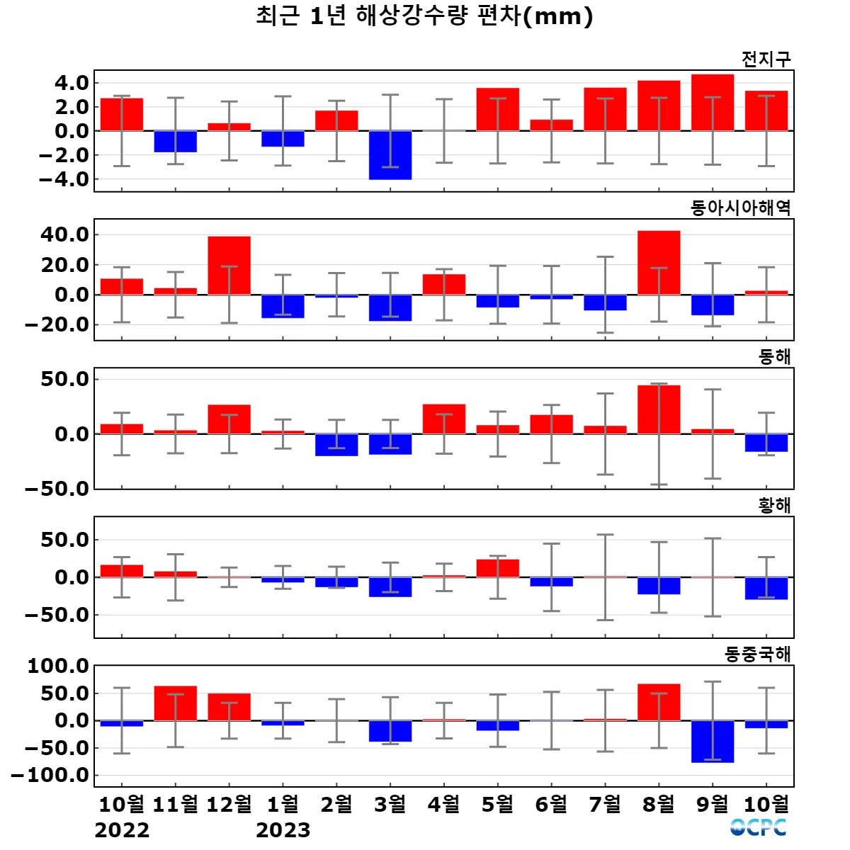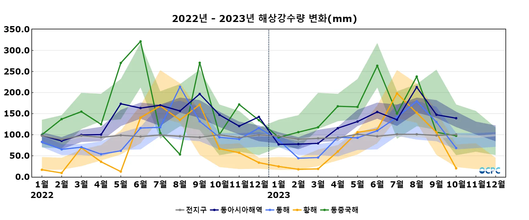 동해의 10월 해상강수량은 10년에 3.5mm 증가하는 추세이며, 황해와 동중국해는 10년에 각각 2.3mm, 3.6mm씩 감소하는 추세입니다.