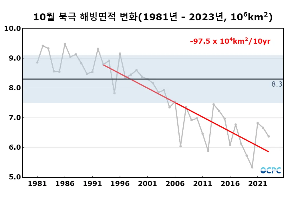 1993~2023년 동안 10월 북극 해빙면적은 10년에 98만km²씩 감소하는 추세입니다.