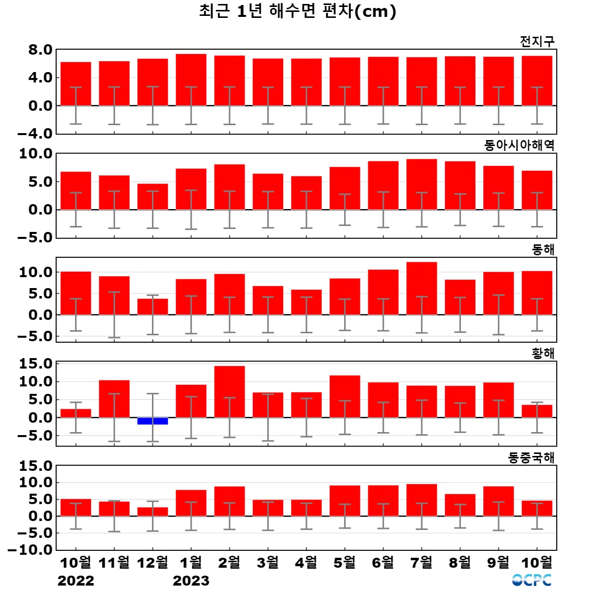 동해, 동중국해의 해수면은 평년(60.6±3.8cm, 98.9±3.8cm)보다 각각 10.3cm, 4.6cm 높았으며, 황해의 해수면은 평년(74.9±4.2cm)과 비슷했습니다.