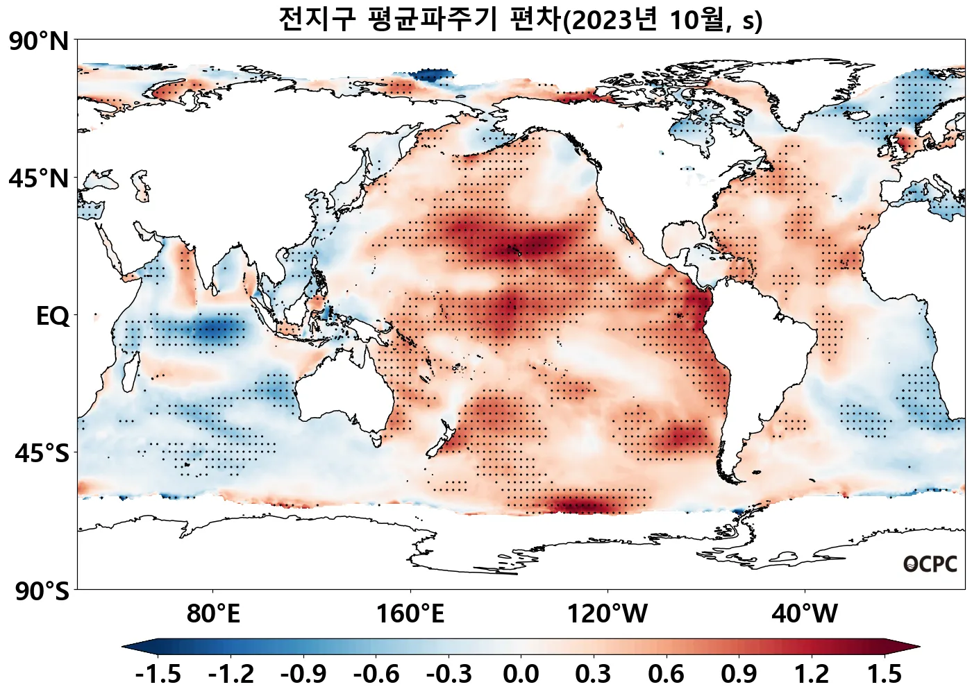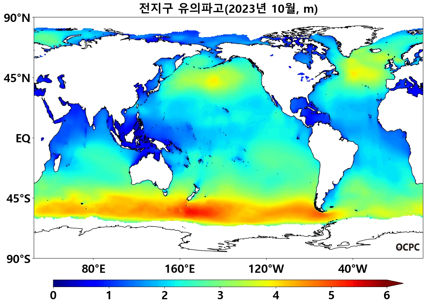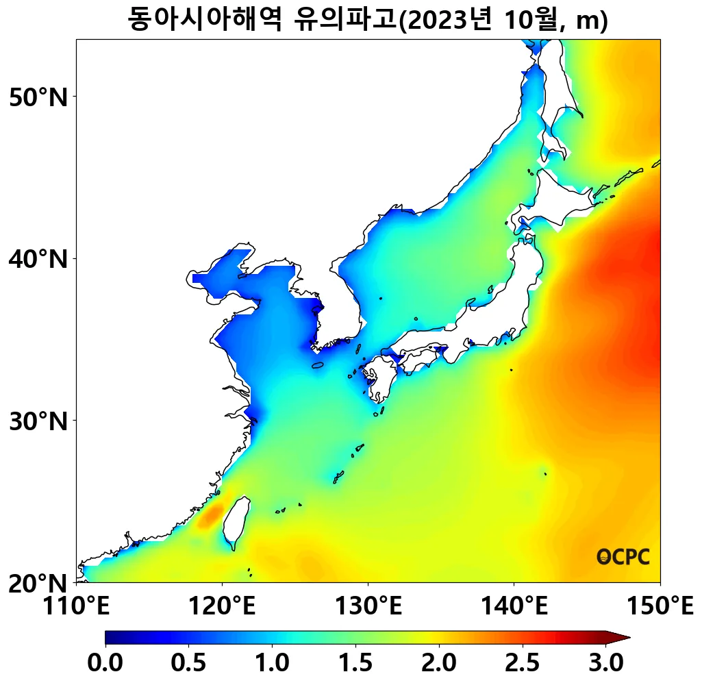 1993~2023년 동안 전지구, 동아시아해역의 10월 평균 유의파고는 10년에 각각 0.3cm, 4.7cm씩 증가하는 추세입니다.