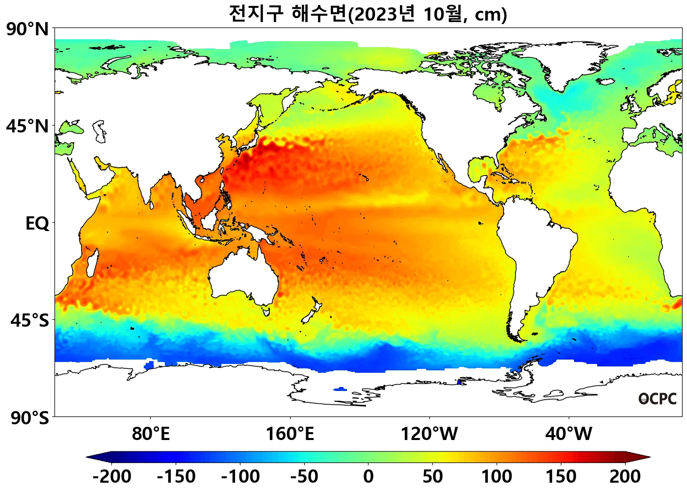 엘니뇨 발달이 지속됨에 따라 동태평양의 해수면이 평년보다 두드러지게 높았으며, 인도양 쌍극진동이 양으로 발달함에 따라 열대 서인도양의 해수면은 높게, 열대 동인도양의 해수면은 낮게 나타났습니다.