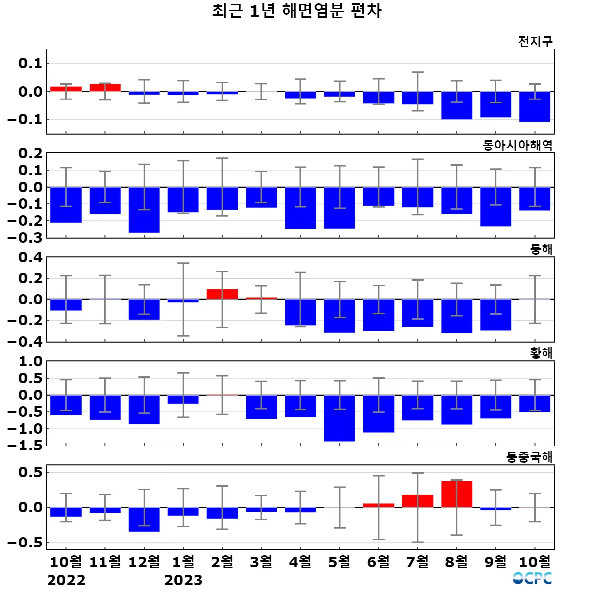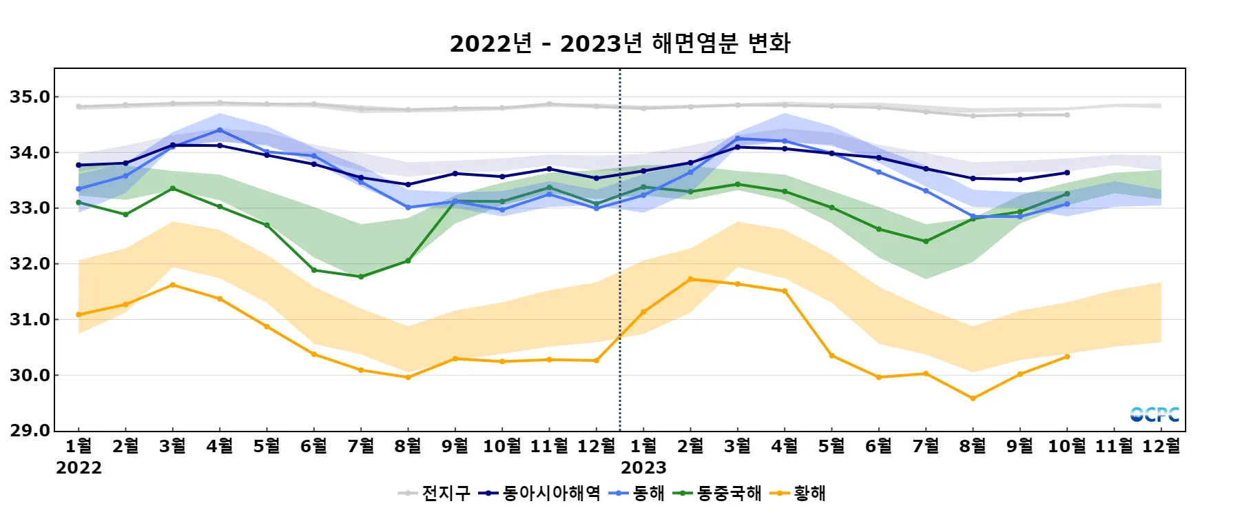 동해와 동중국해 해면염분은 자료기간 평균(33.1±0.2, 33.3±0.2)과 비슷했으며, 황해 해면염분은 자료기간 평균(30.8±0.5)보다 0.5 낮았습니다.