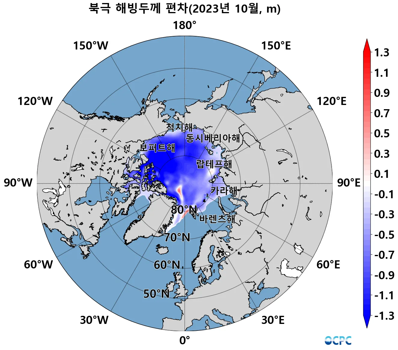 특히, 올해 해빙 감소가 두드러진 보퍼트해와 폴리냐가 발생한 동시베리아해에서 평년대비 해빙 두께 감소가 두드러지게 나타났습니다.