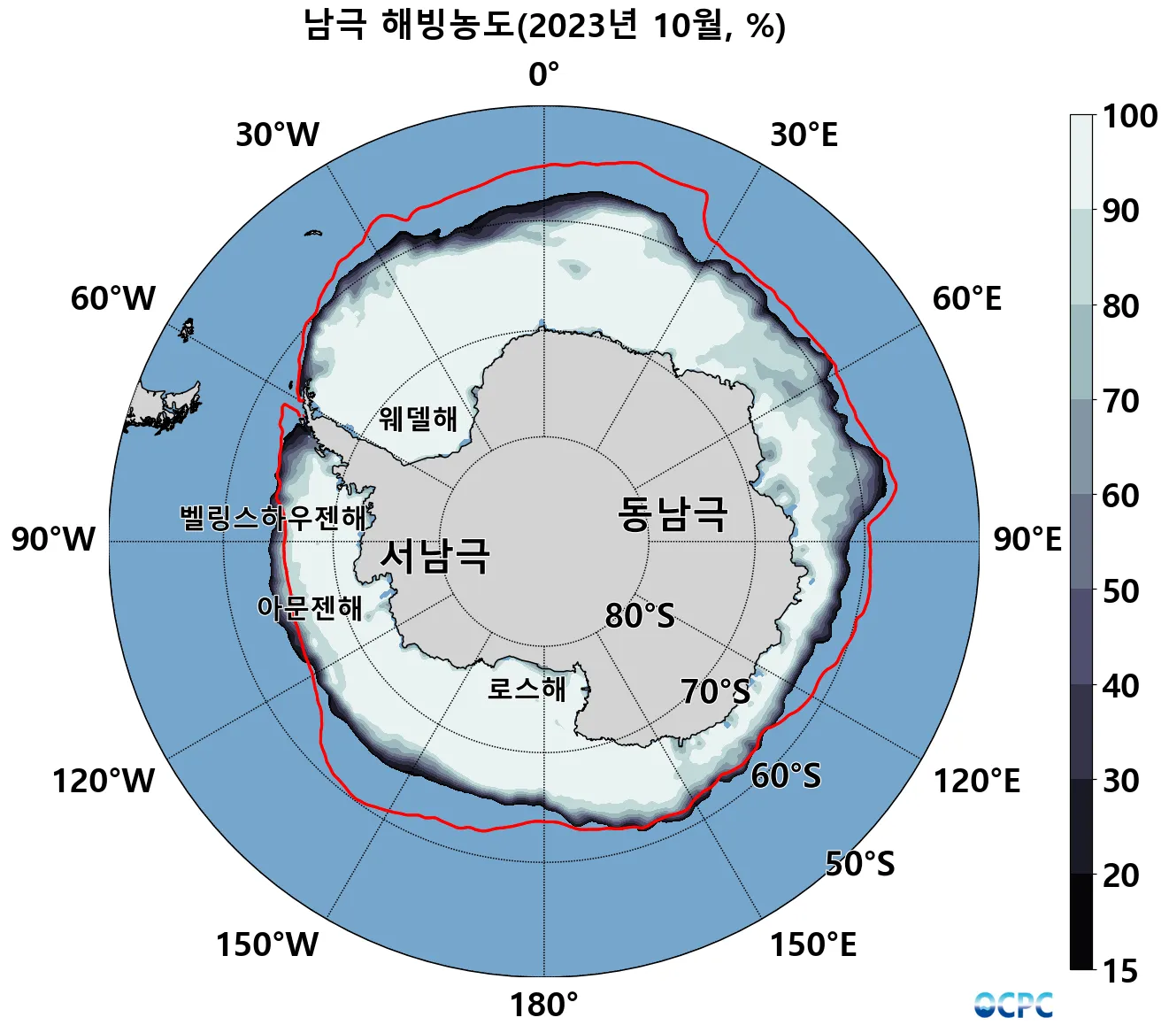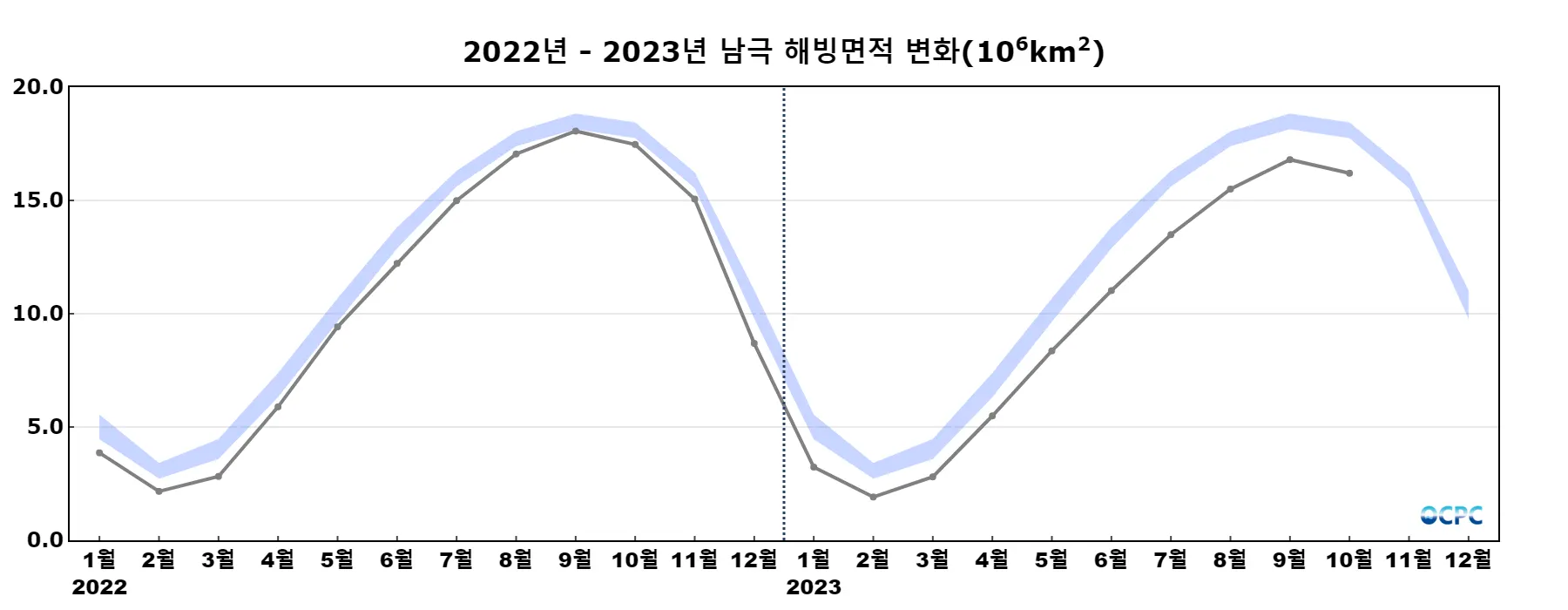 10월 남극 해빙면적은 1,620만km²로 평년(1,810만±35만km²)보다 190만km²(10.5%) 작았습니다. 이는 자료기간(1981년~2023년) 중 가장 작은 값입니다.