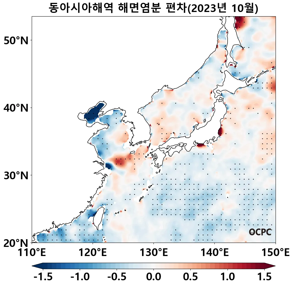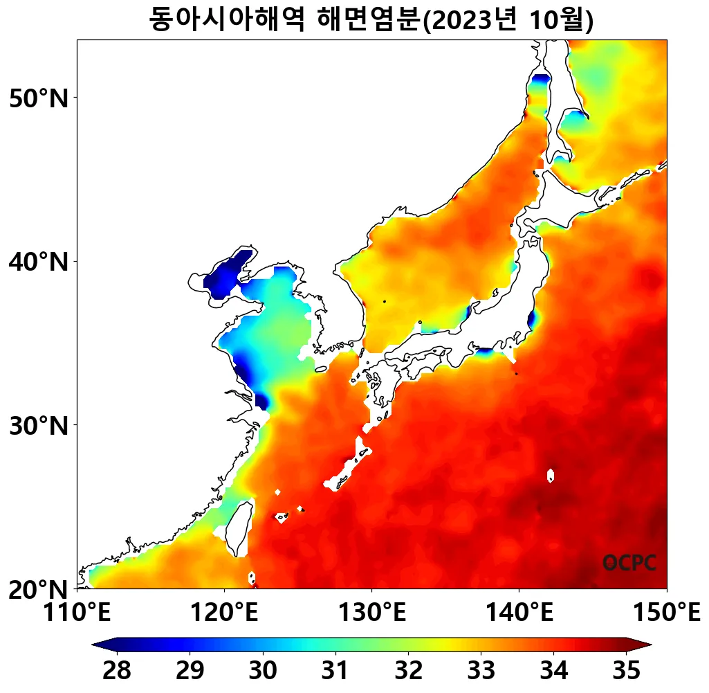 동아시아해역 해면염분은 자료기간 평균(33.8±0.1)보다 0.1 낮았습니다.