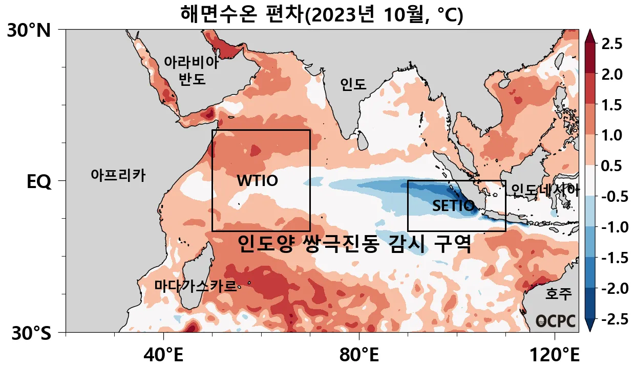 2023년 10월 평균 해면수온의 평년 대비 편차(사각형은 인도양 쌍극진동 감시구역으로 각각 WTIO(열대서인도양), SETIO(열대 남동인도양) 해역이며, 인도양 쌍극진동 지수(DMI: Dipole Mode Index)는 WTIO의 평년 대비 편차에서 SETIO의 평년 대비 편차를 뺀 값입니다.)
