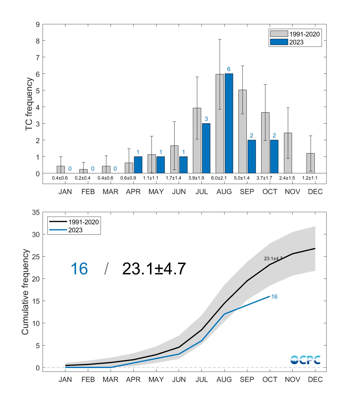 2023년 10월에는 평년(3.7개) 보다 적은 2개의 태풍이 발생하였습니다.