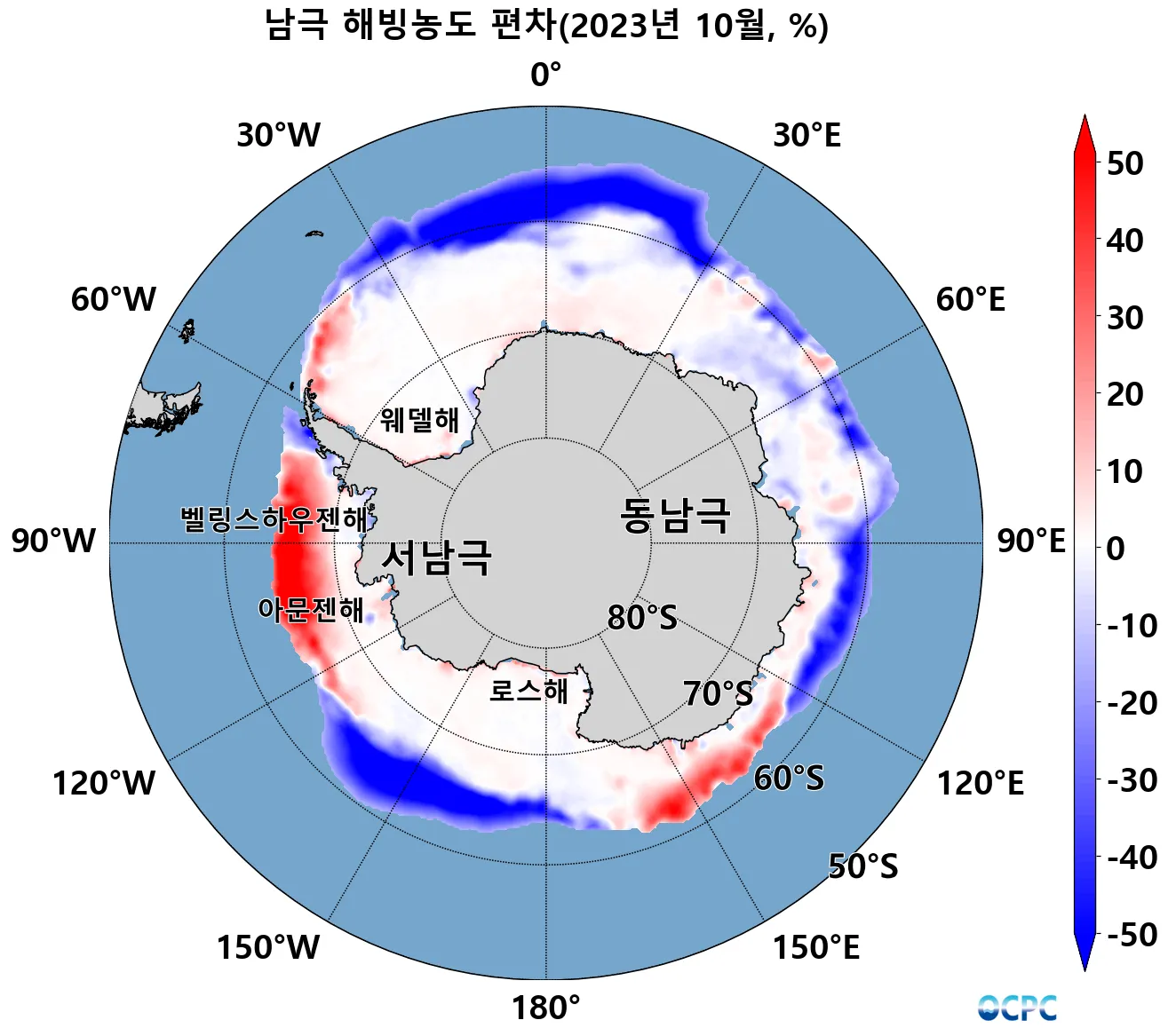 동태평양의 엘니뇨 발달에 따라 저위도의 따뜻한 해류의 유입으로 아문젠해와 벨링스하우젠해를 제외한 대부분의 해역에서 평년 대비 해빙면적이 감소했습니다.