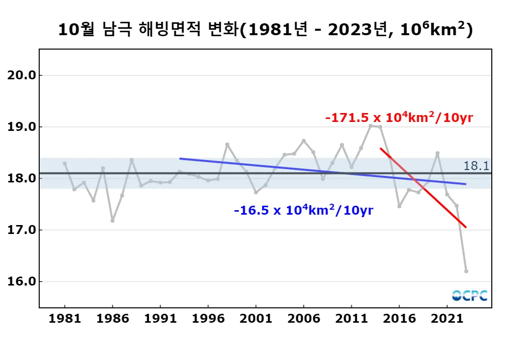 10월 남극 해빙면적은 1993~2023년 동안 10년에 17만km²씩 감소하는 추세이며, 최근 10년(2014~2023년) 동안에는 172만km²씩 감소하는 추세입니다.