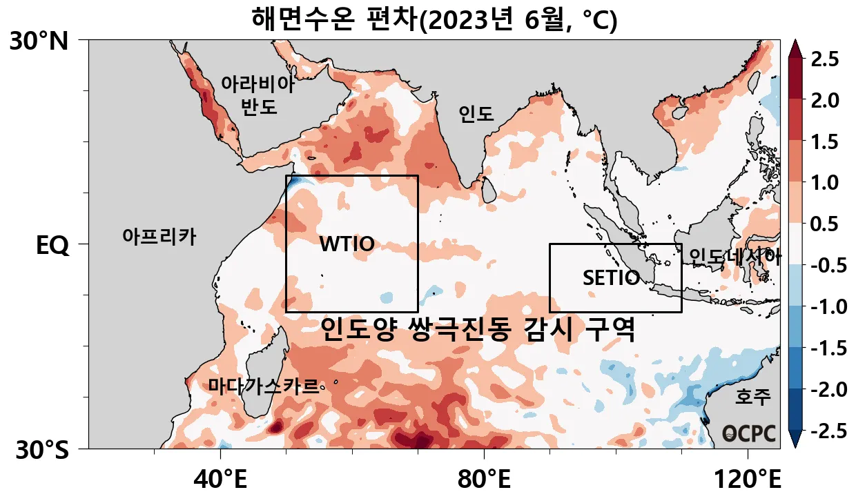 2023년 6월 평균 해면수온의 평년 대비 편차(사각형은 인도양 쌍극진동 감시구역으로 각각 WTIO(열대서인도양), SETIO(열대 남동인도양) 해역이며, 인도양 쌍극진동 지수(DMI: Dipole Mode Index)는 WTIO의 평년 대비 편차에서 SETIO의 평년 대비 편차를 뺀 값입니다.)