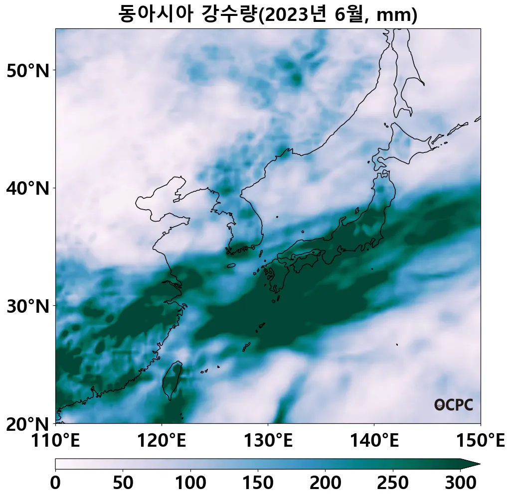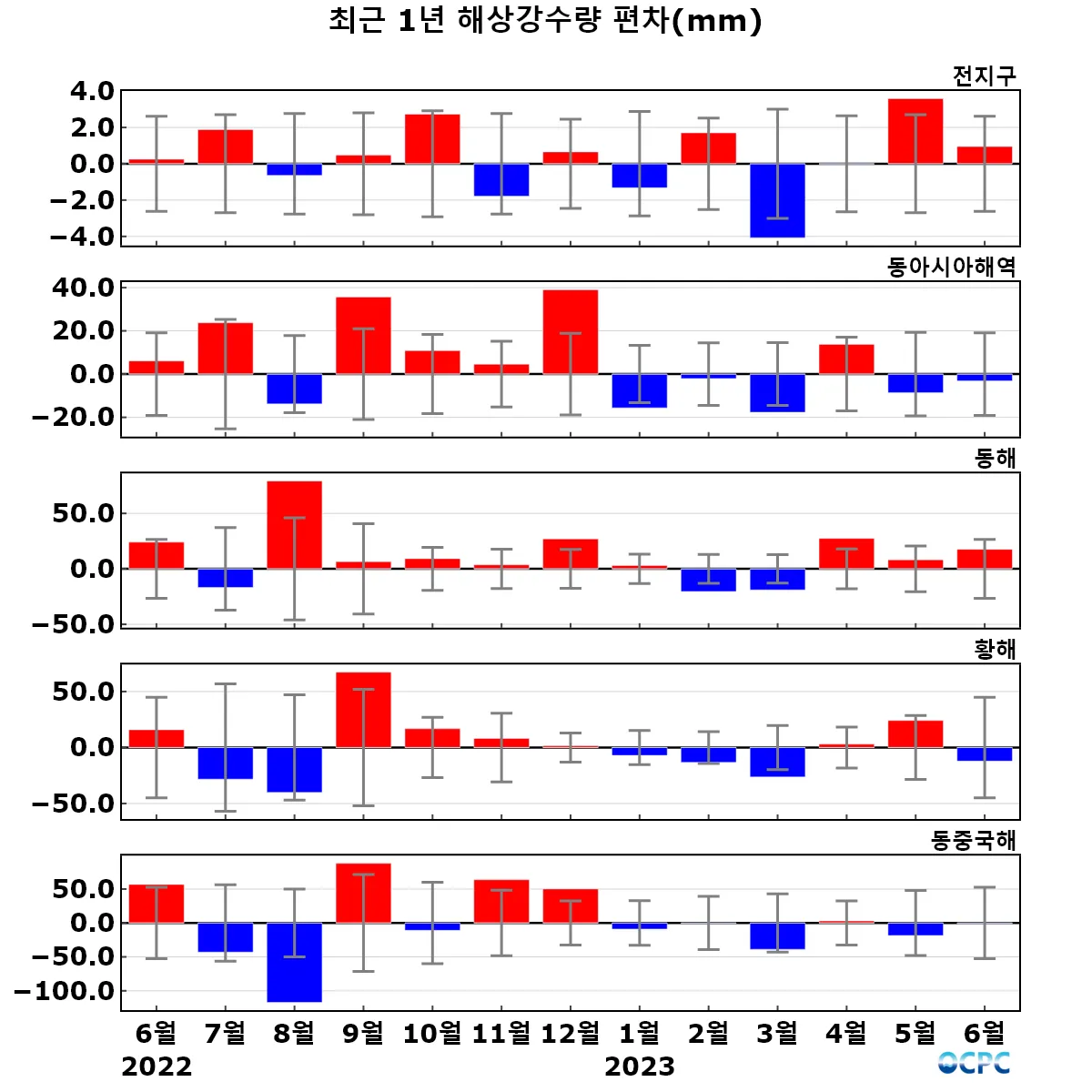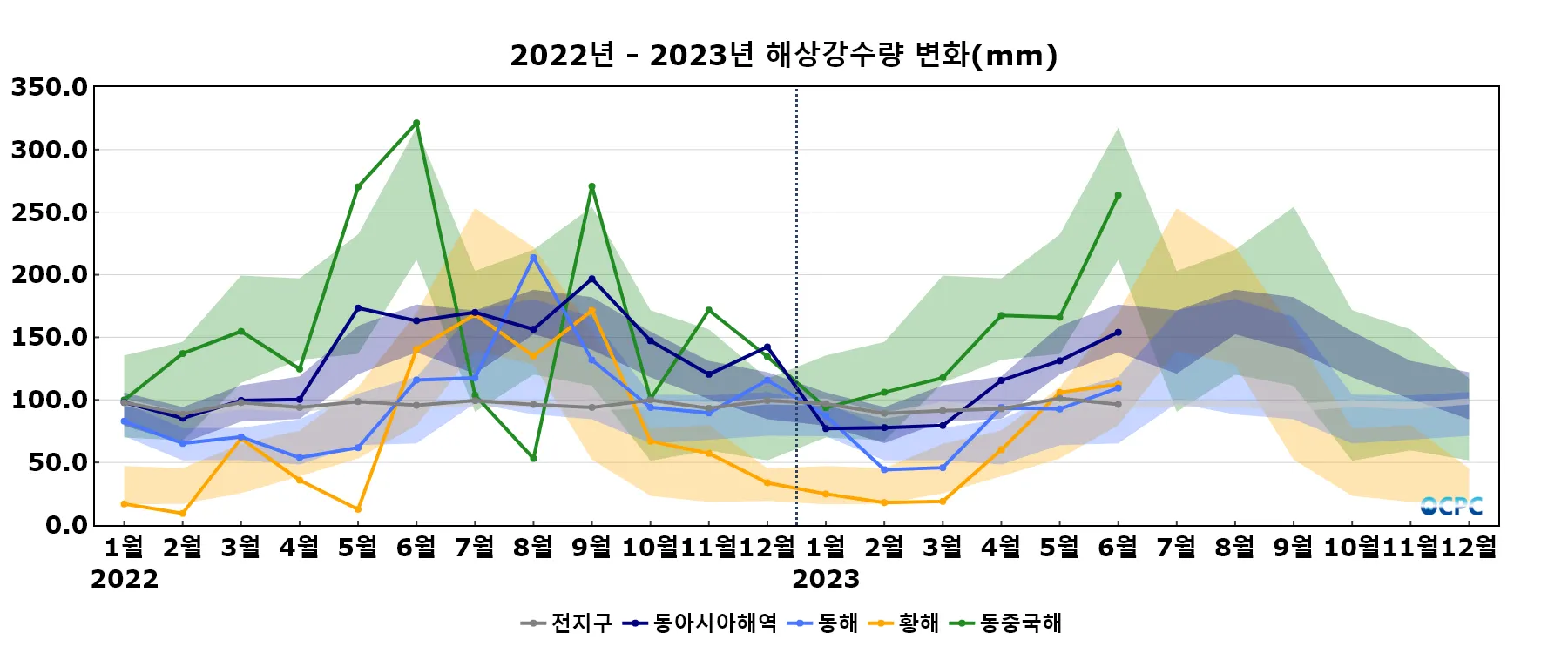 동해, 황해, 동중국해의 해상강수량은 평년(91.9±26.6mm, 124.6±44.9mm, 264.7±52.7mm)과 비슷했습니다.