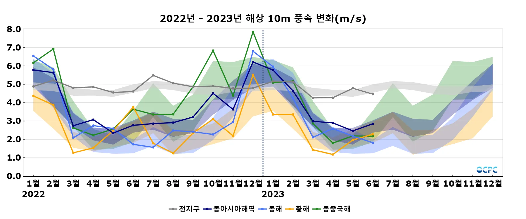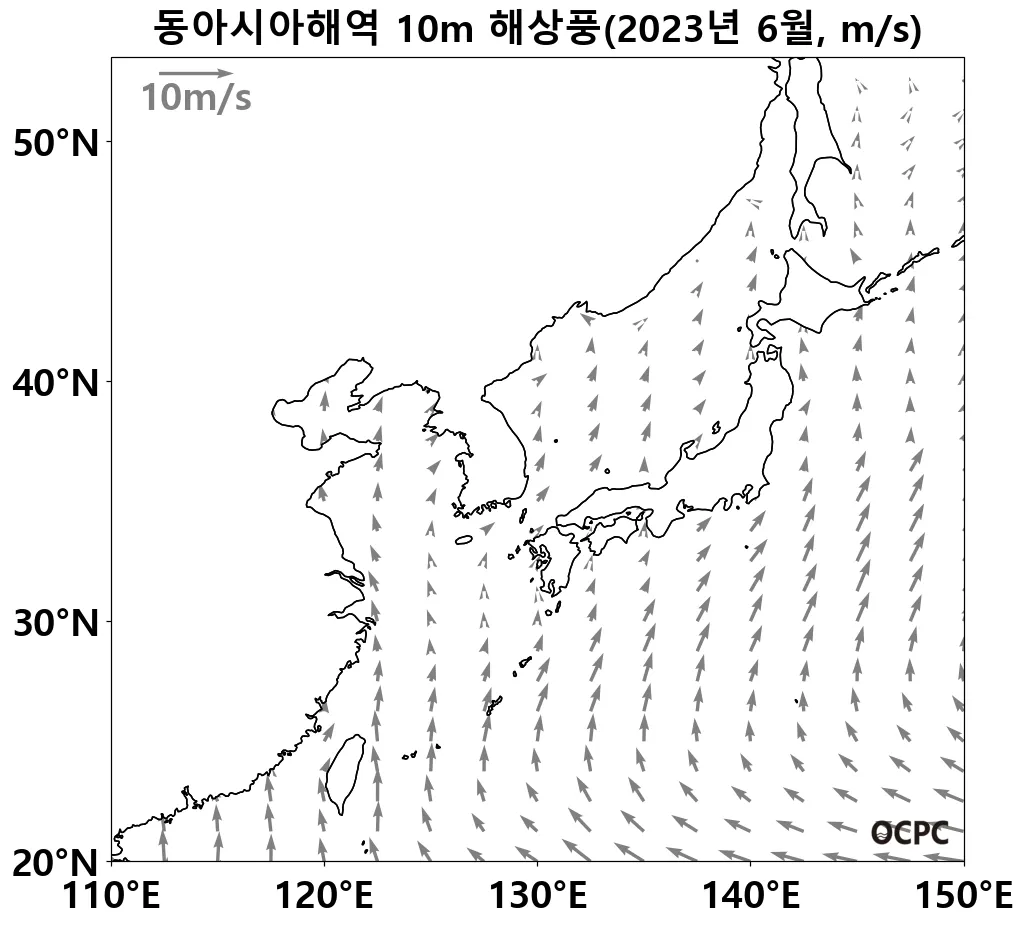 황해의 6월 해상풍속은 10년에 0.1m/s씩 증가하며, 동중국해는 10년 동안 0.2m/s씩 감소하는 추세입니다.