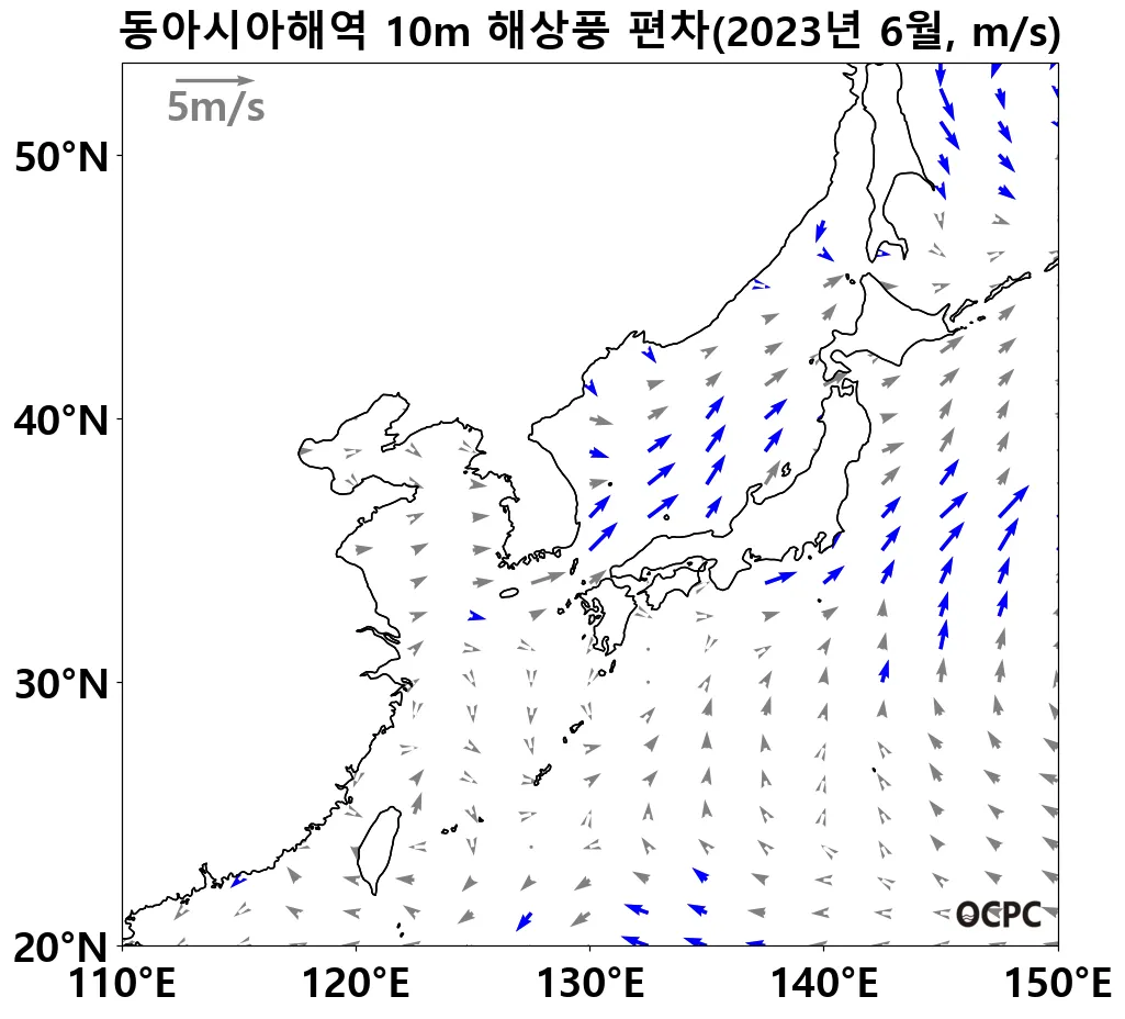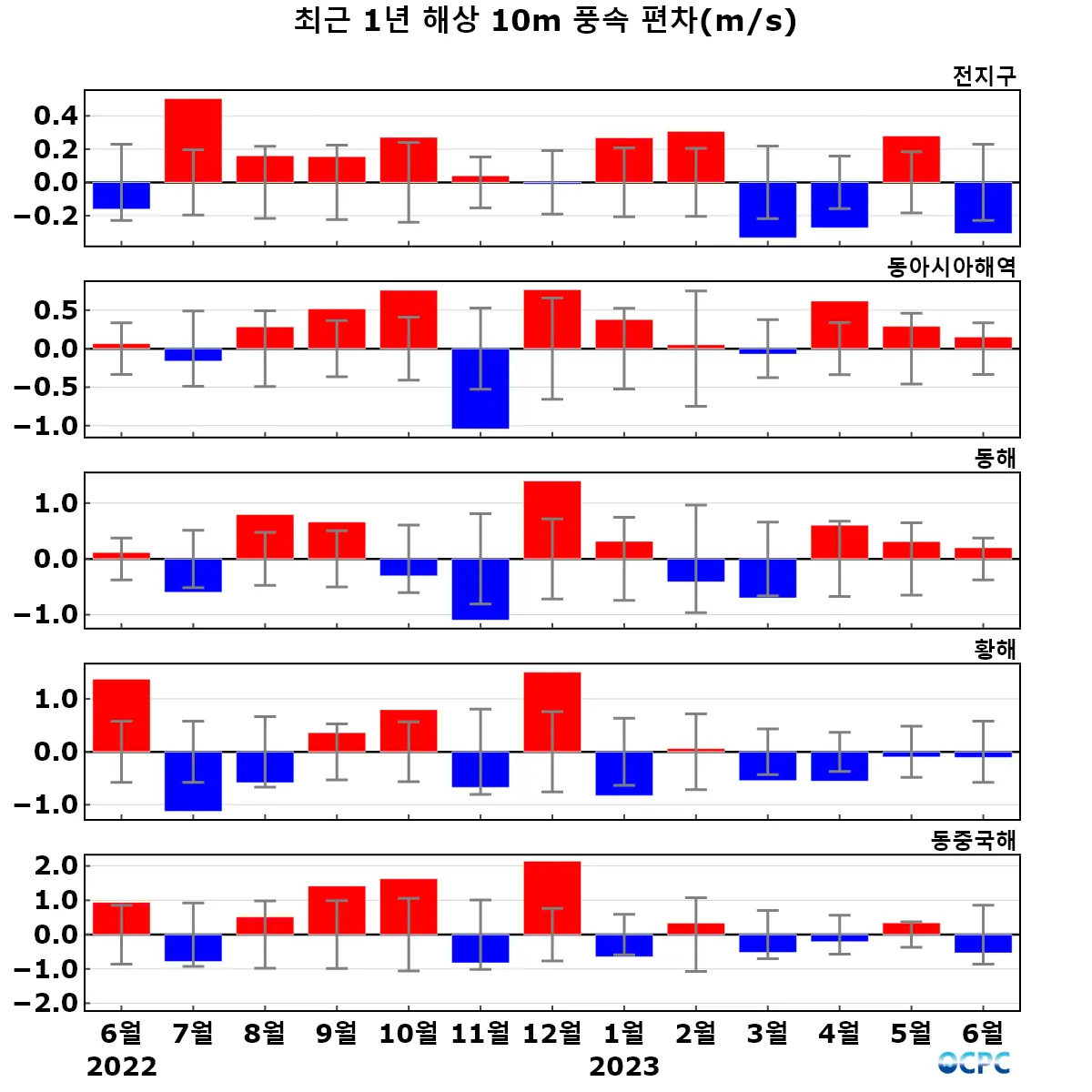 동해, 황해, 동중국해의 해상풍속은 평년(1.6±0.4m/s, 2.4±0.6m/s, 2.7±0.9m/s)과 비슷했습니다.