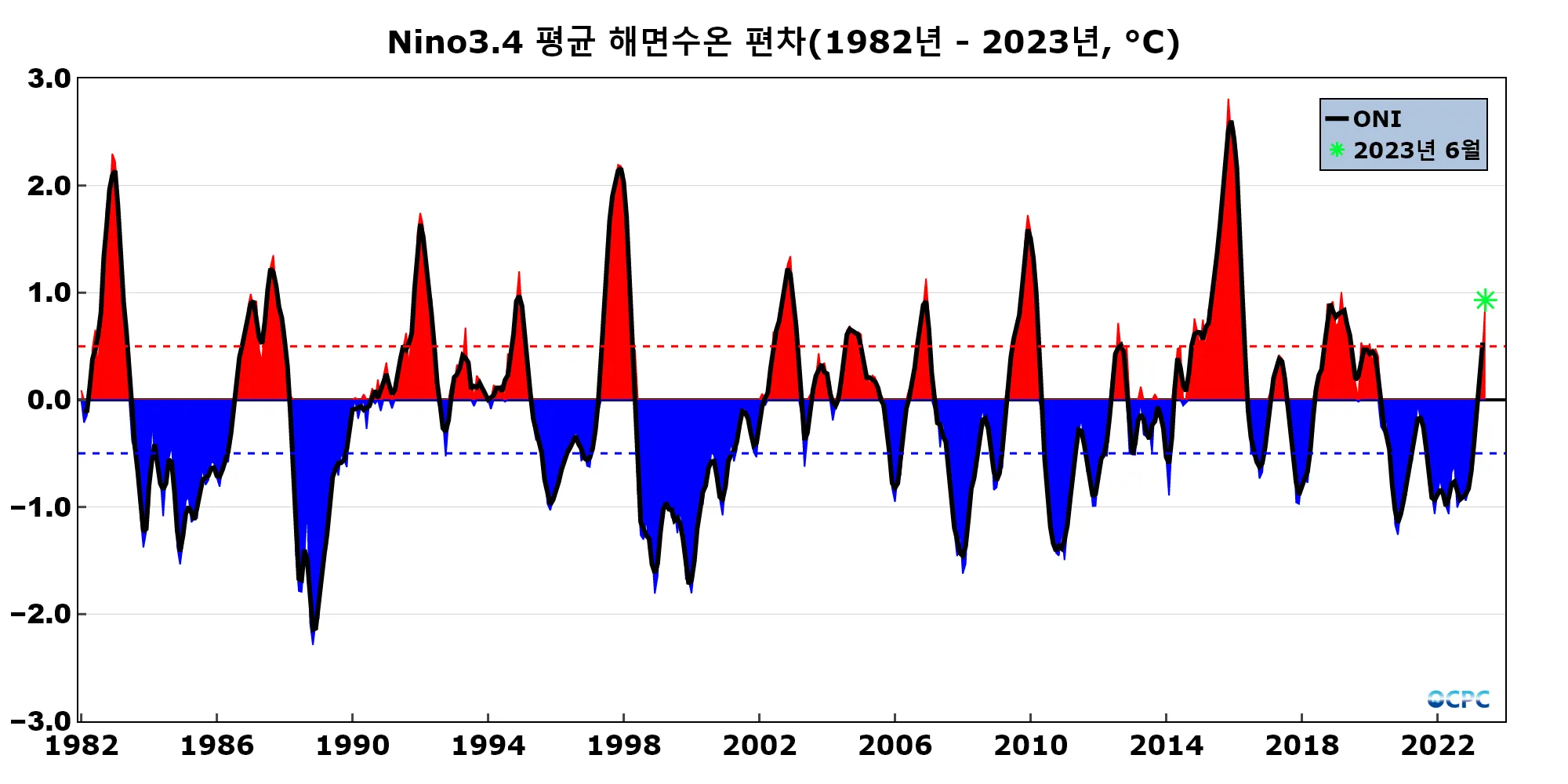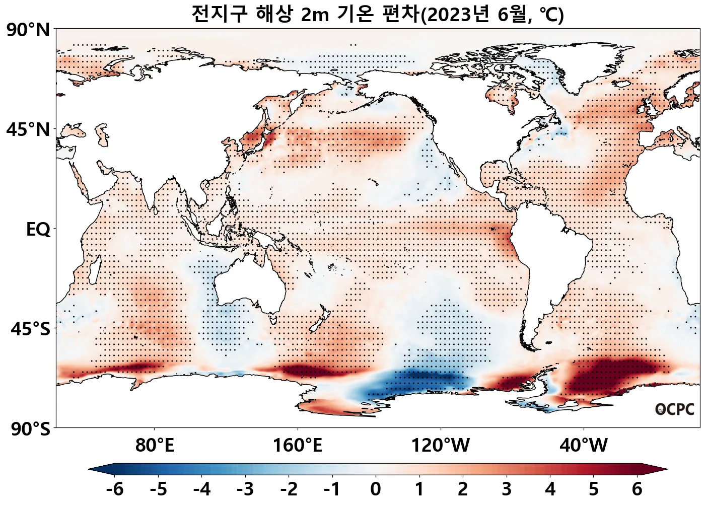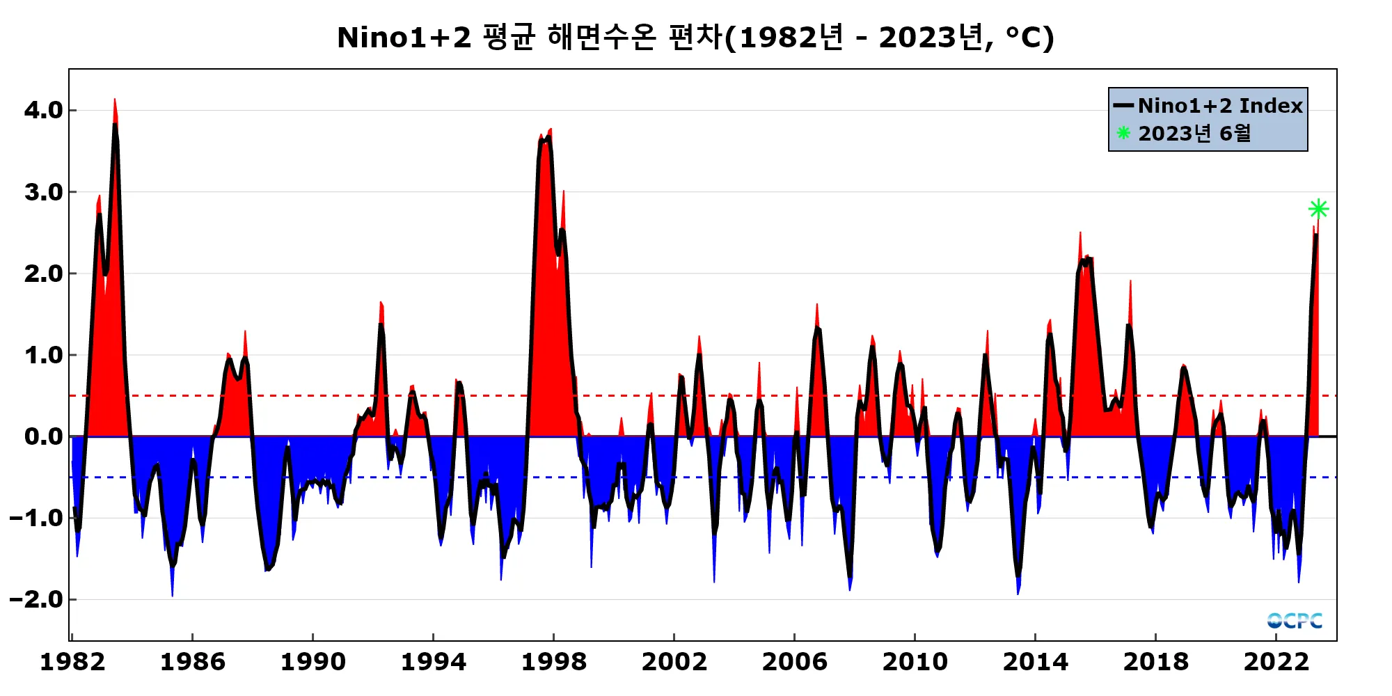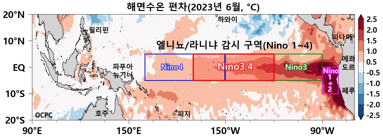 엘니뇨/라니냐 감시구역인 열대태평양 Nino3.4 해역(5°S~5°N, 170°W~120°W)의 6월 평균 해면수온 편차는 0.9°C, Nino1+2해역(0°S~10°N, 90°W~80°W)은 2.8°C로 엘니뇨가 강하게 발달하고 있습니다.