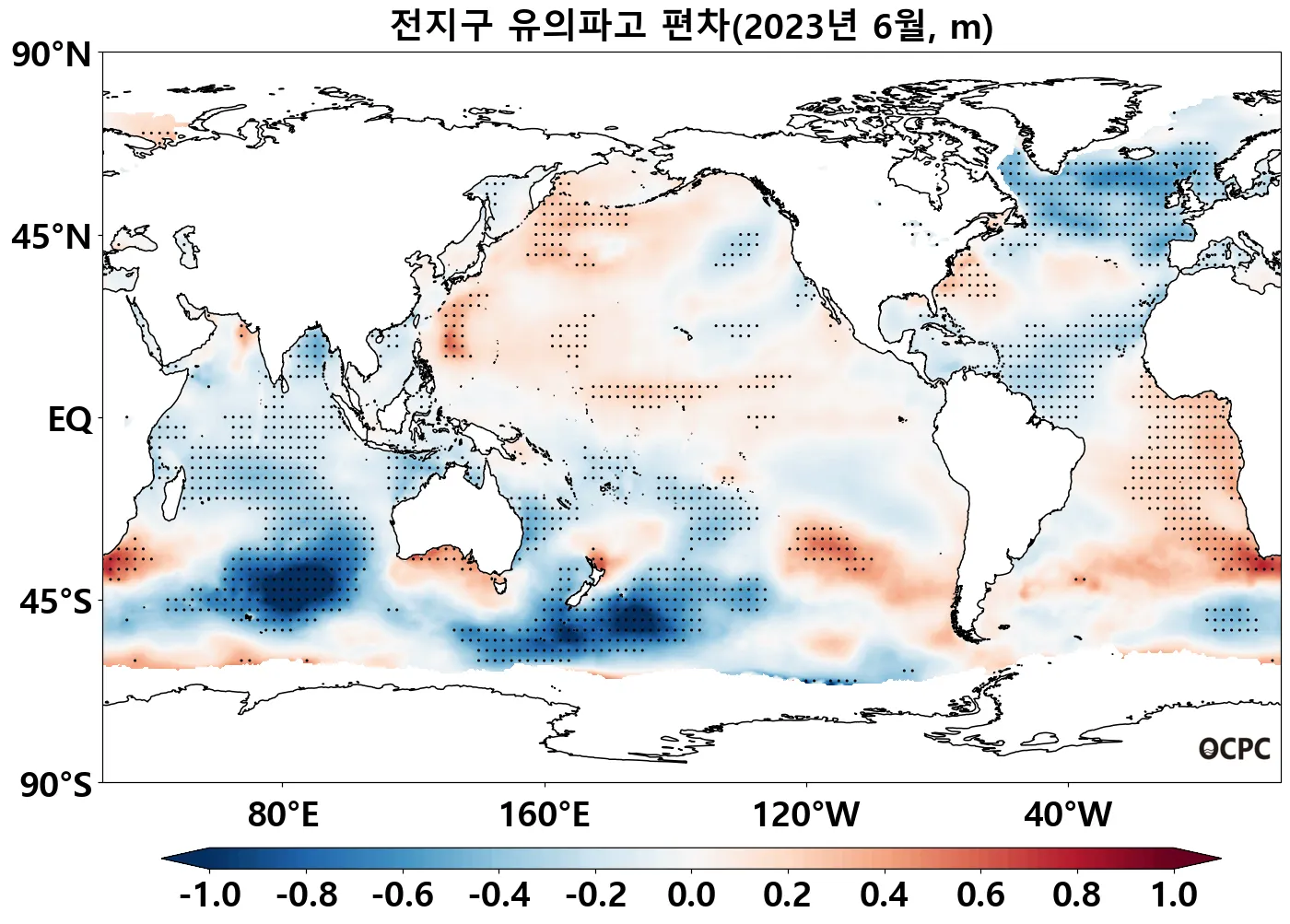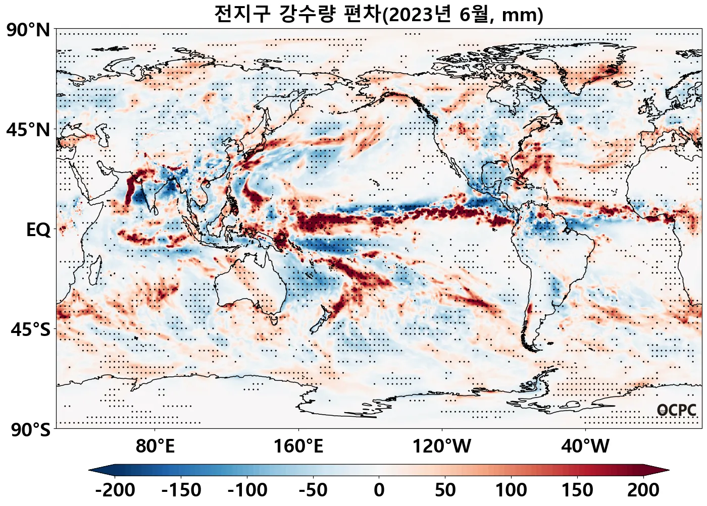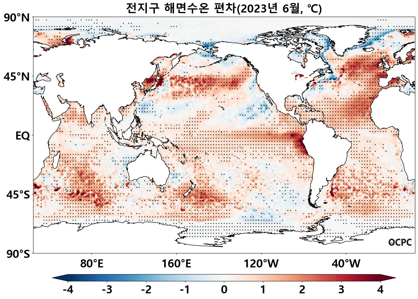 엘니뇨/라니냐 감시구역인 열대태평양 Nino3.4 해역(5°S~5°N, 170°W~120°W)의 6월 평균 해면수온 편차는 0.9°C, Nino1+2해역(0°S~10°N, 90°W~80°W)은 2.8°C로 엘니뇨가 강하게 발달하고 있습니다.
