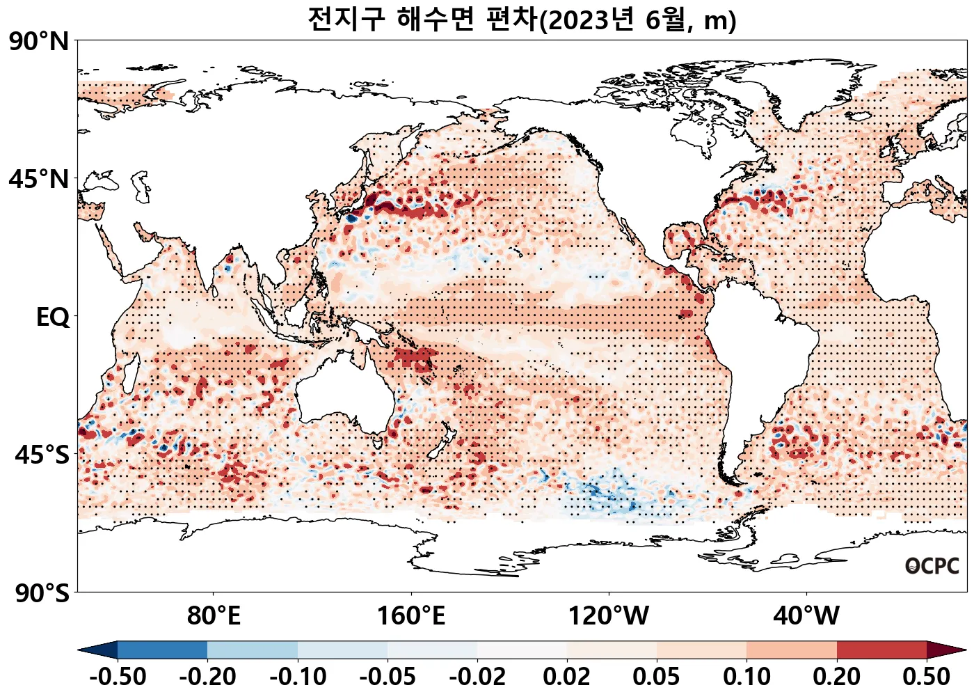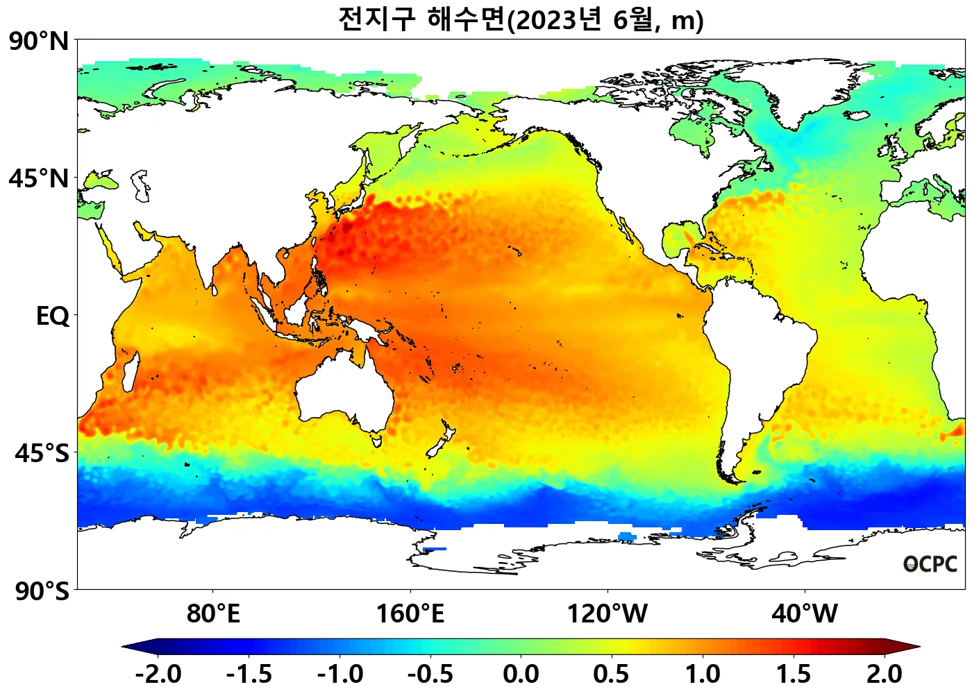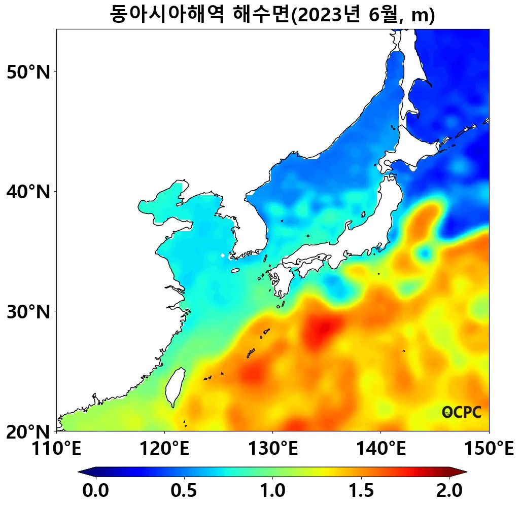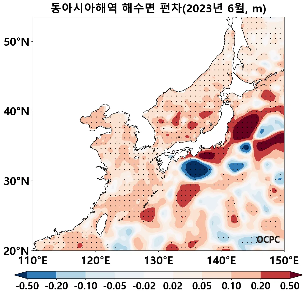 동해, 황해, 동중국해의 해수면은 평년(48.6±3.7cm, 61.8±4.2cm, 85.7±3.7cm)보다 각각 10.6cm, 9.8cm, 9.2cm 높았으며, 특히 동해, 동중국해의 해수면은 1993~2023년(6월) 중 가장 높았습니다.