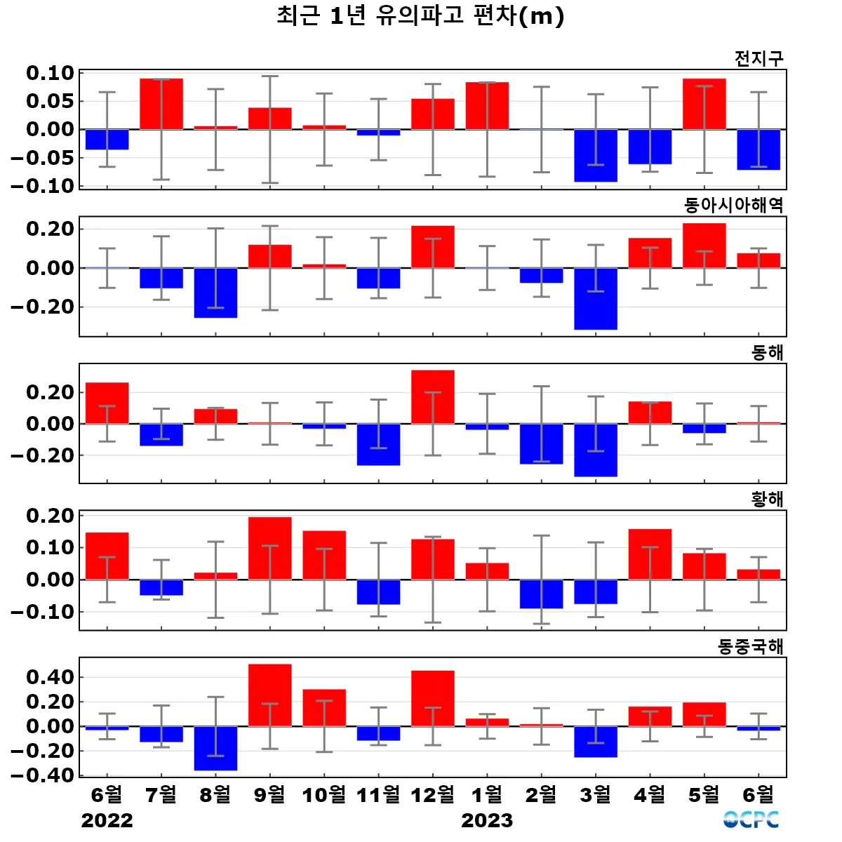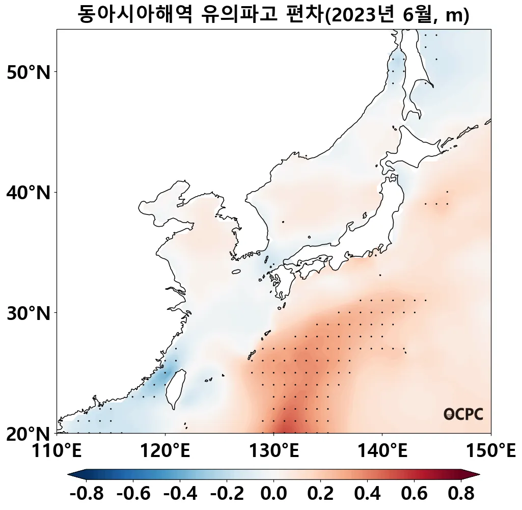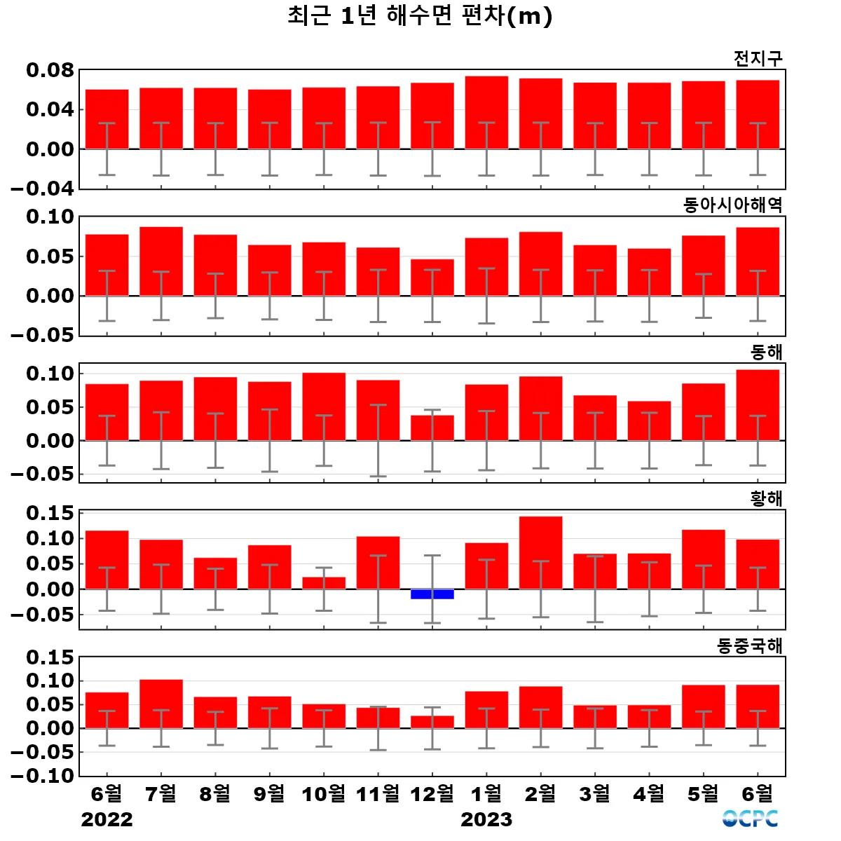 동해, 황해, 동중국해의 해수면은 평년(48.6±3.7cm, 61.8±4.2cm, 85.7±3.7cm)보다 각각 10.6cm, 9.8cm, 9.2cm 높았으며, 특히 동해, 동중국해의 해수면은 1993~2023년(6월) 중 가장 높았습니다.