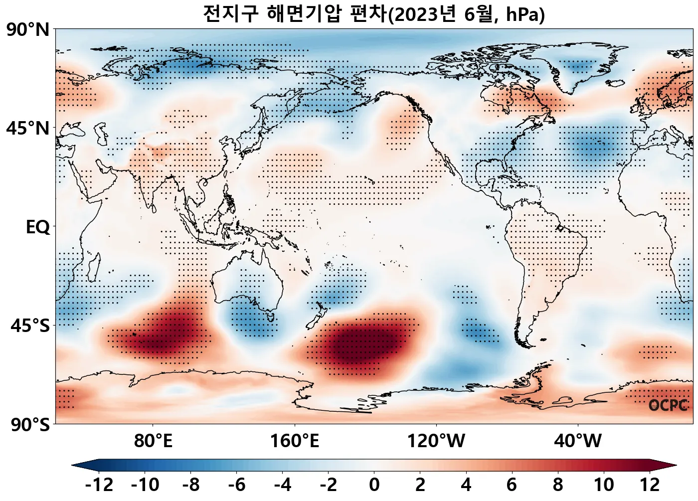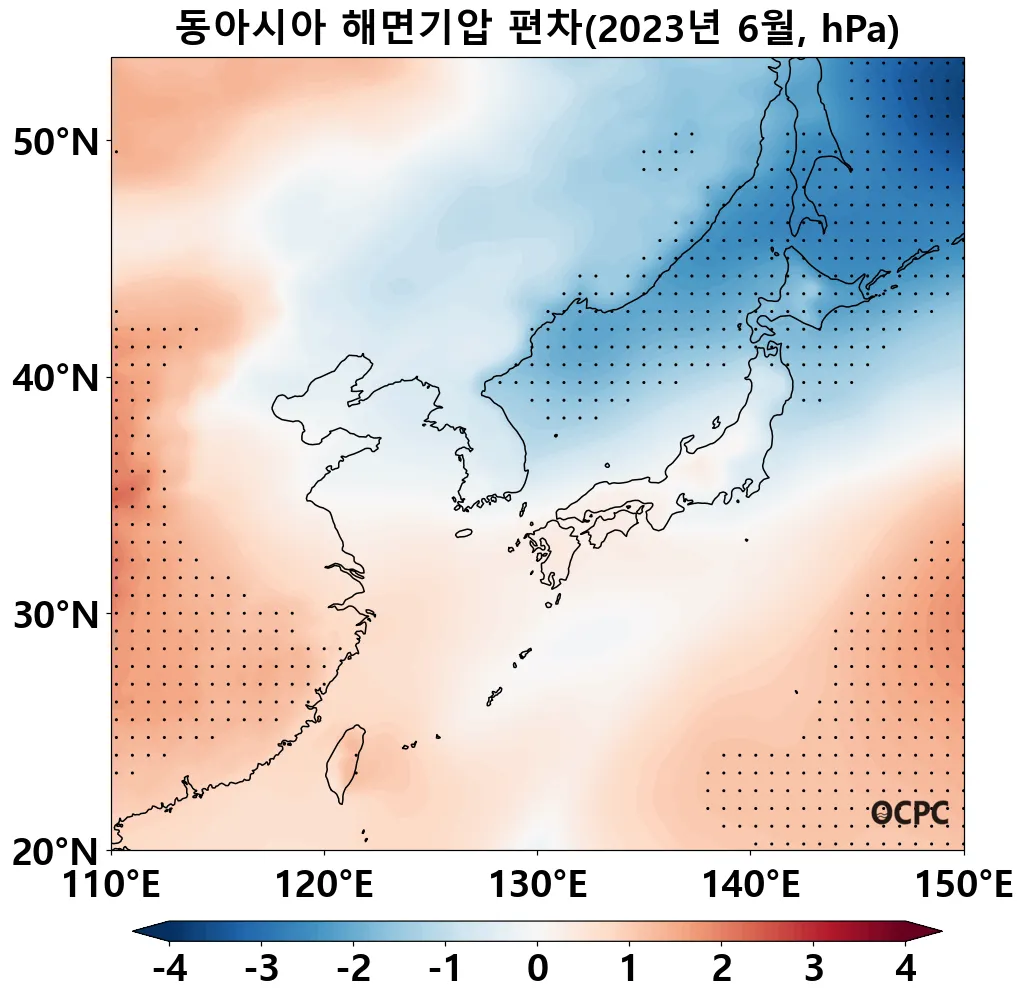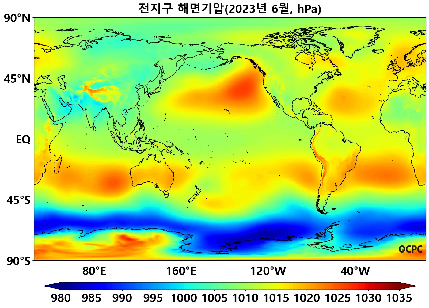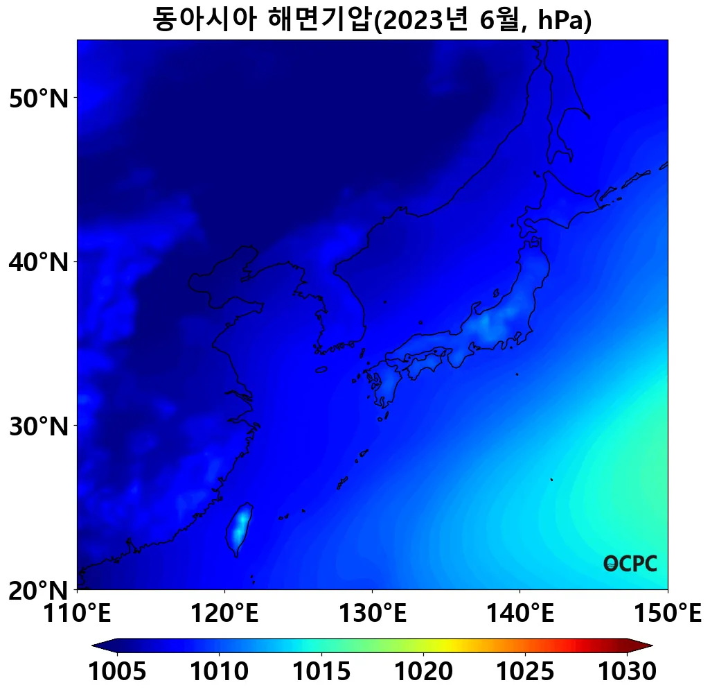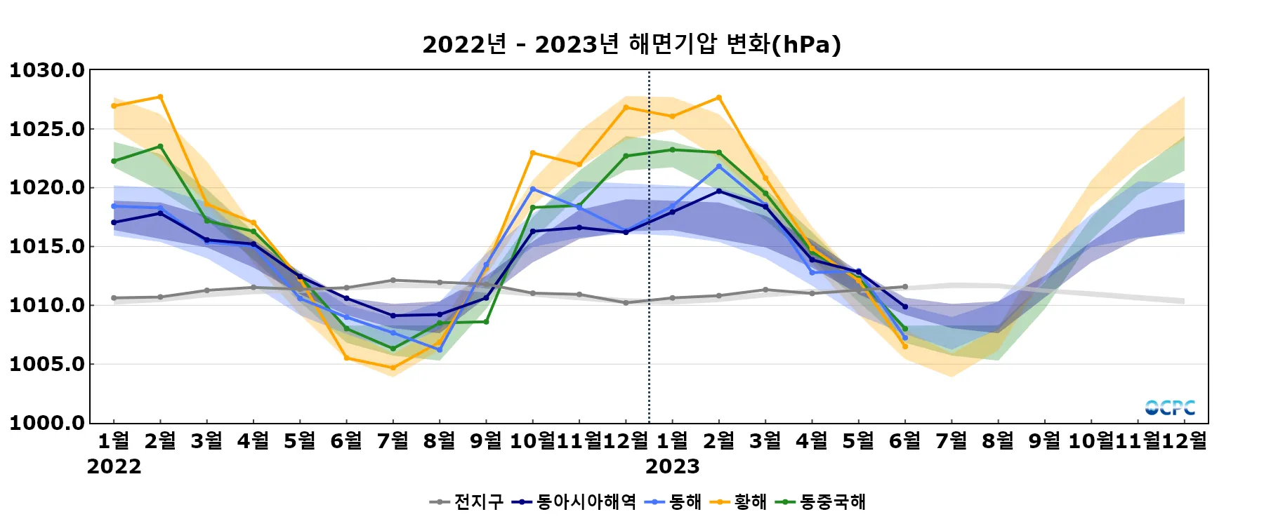 1993~2023년 동안 전지구 6월 해면기압은 10년에 0.1hPa씩 증가하는 추세이며, 동아시아는 10년에 0.1hPa씩 감소하는 추세입니다.