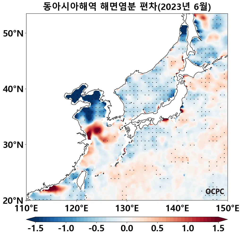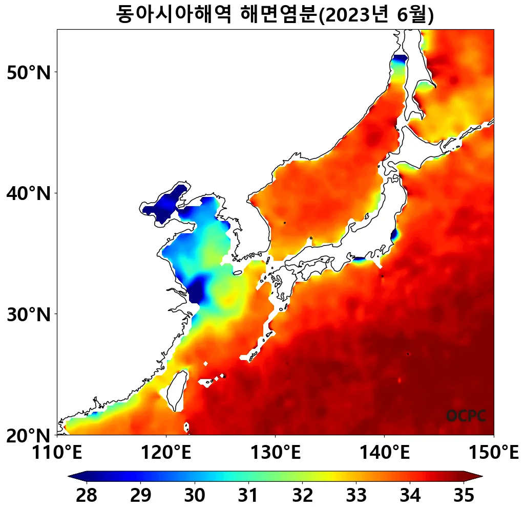 평년보다 적은 담수 유입량으로 인해 장강 하구역(122~123°E, 30~32°N) 해면염분은 자료기간 평균보다 높은 것으로 추정됩니다.