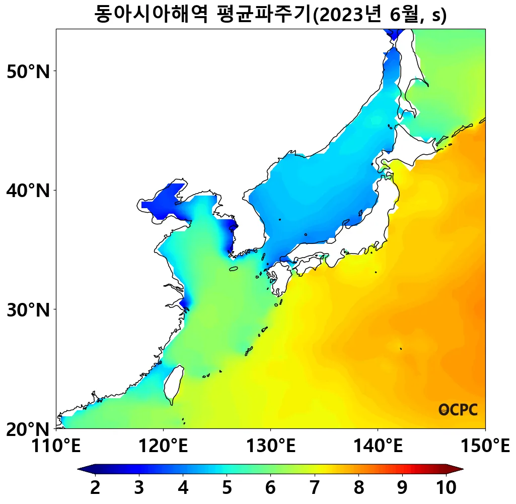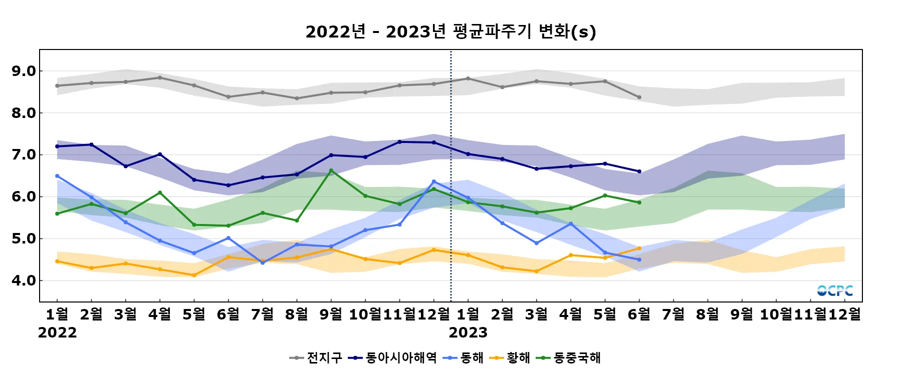 황해의 평균파주기는 평년(4.5±0.3초)보다 0.3초 증가했고, 동해, 동중국해는 평년(4.5±0.3초, 5.6±0.3초)과 비슷했습니다.