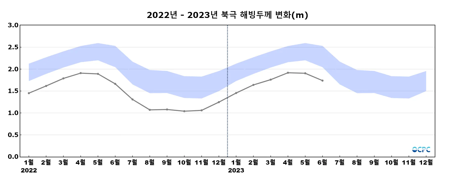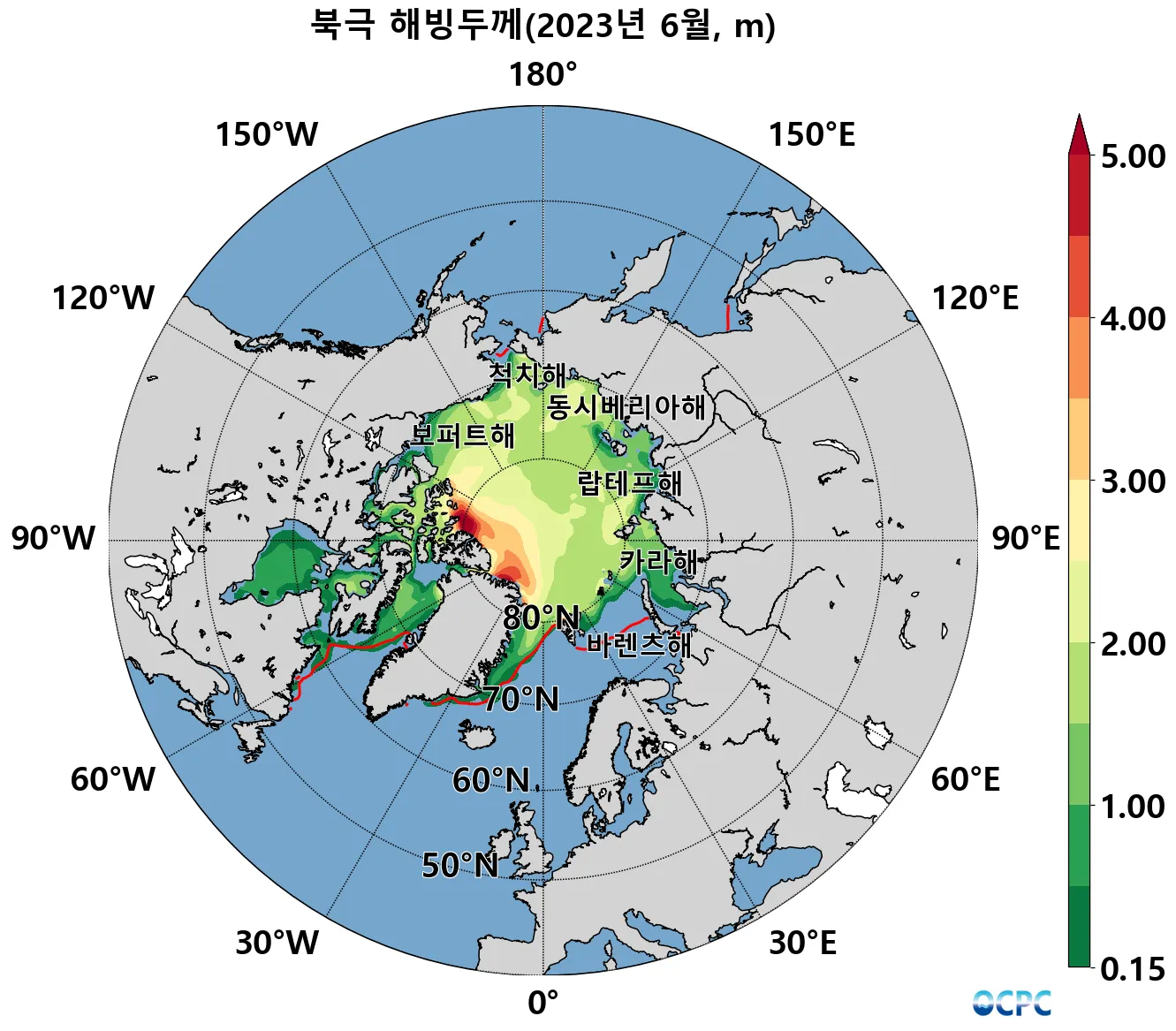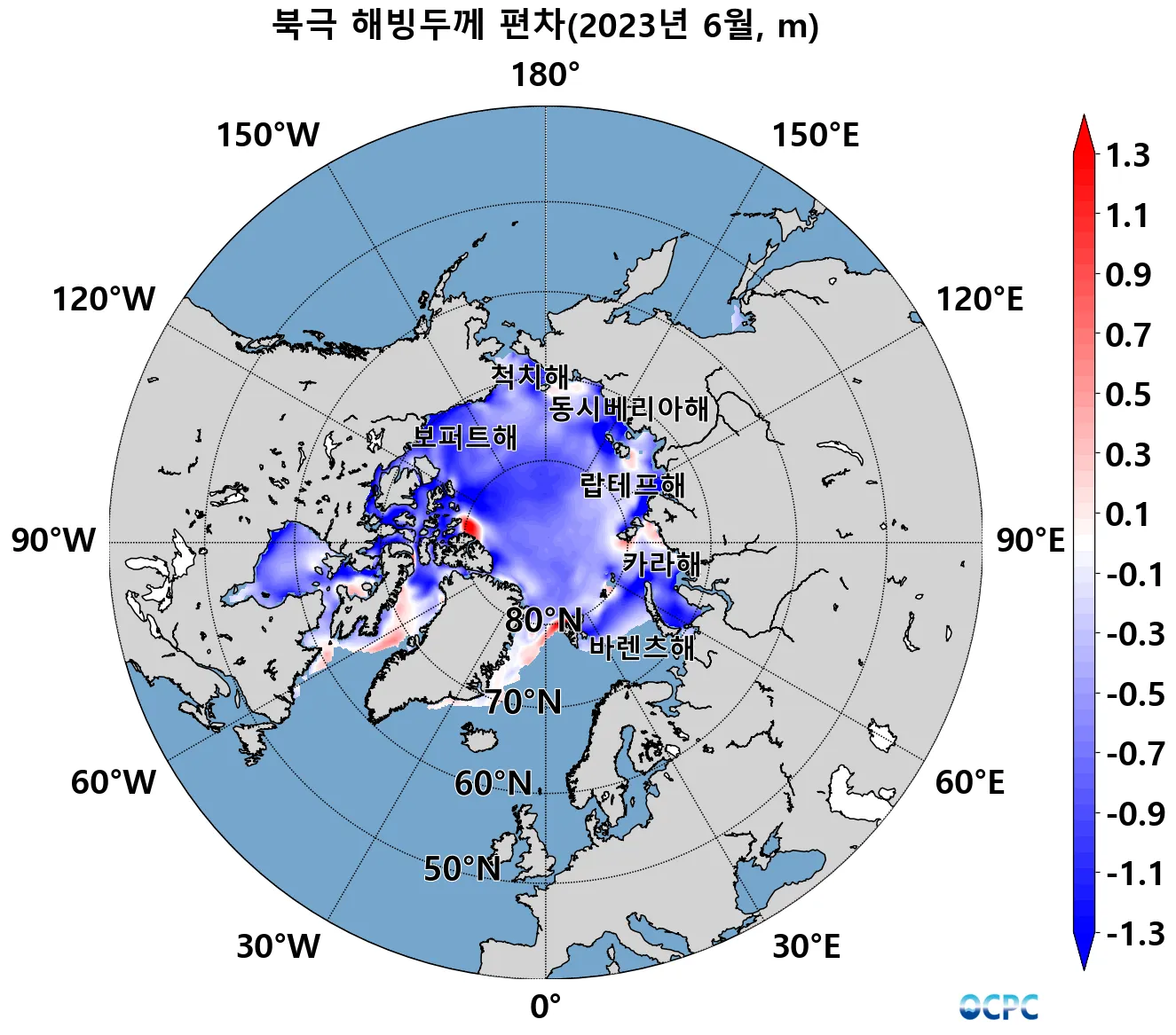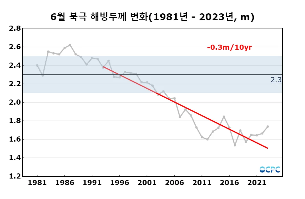 6월 북극 해빙두께는 1.7m로 평년(2.3±0.2m)보다 약 0.6m(24.0%) 감소했으며, 1993~2023년 동안 10년에 약 0.3m씩 감소하는 추세입니다.