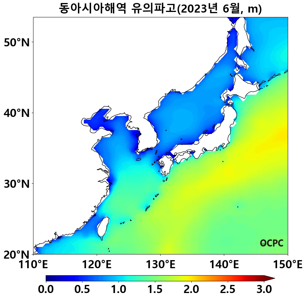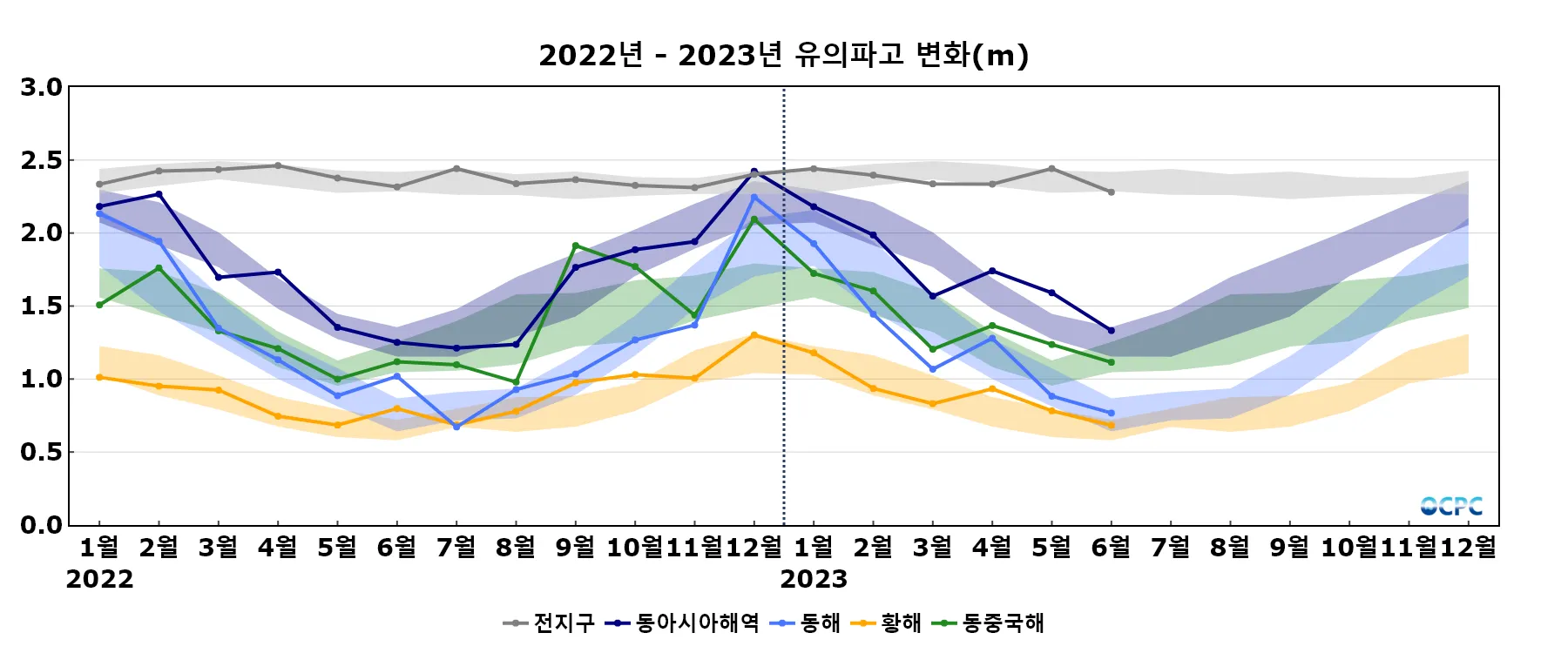 동해, 황해, 동중국해의 평균 유의파고는 평년(0.8±0.1m, 0.7±0.1m, 1.2±0.1m)과 비슷했습니다.