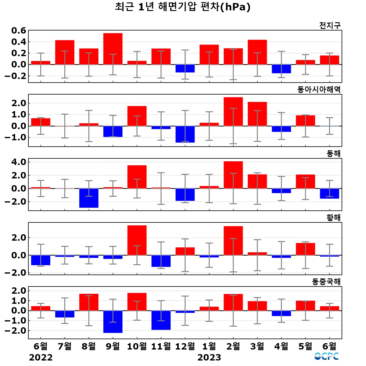 동해의 해면기압은 평년(1008.8±1.2hPa)보다 1.5hPa 낮았던 반면, 황해와 동중국해의 해면기압은 평년(1006.7±1.3hPa, 1007.6±0.7hPa)과 비슷했습니다.
