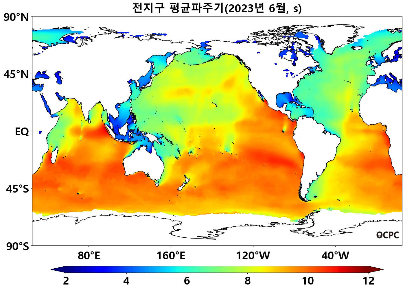 파랑(유의파고, 평균파주기) 자료의 영역별 평균을 산출함에 있어 위도 가중치를 적용하였습니다. (2023.07.14)