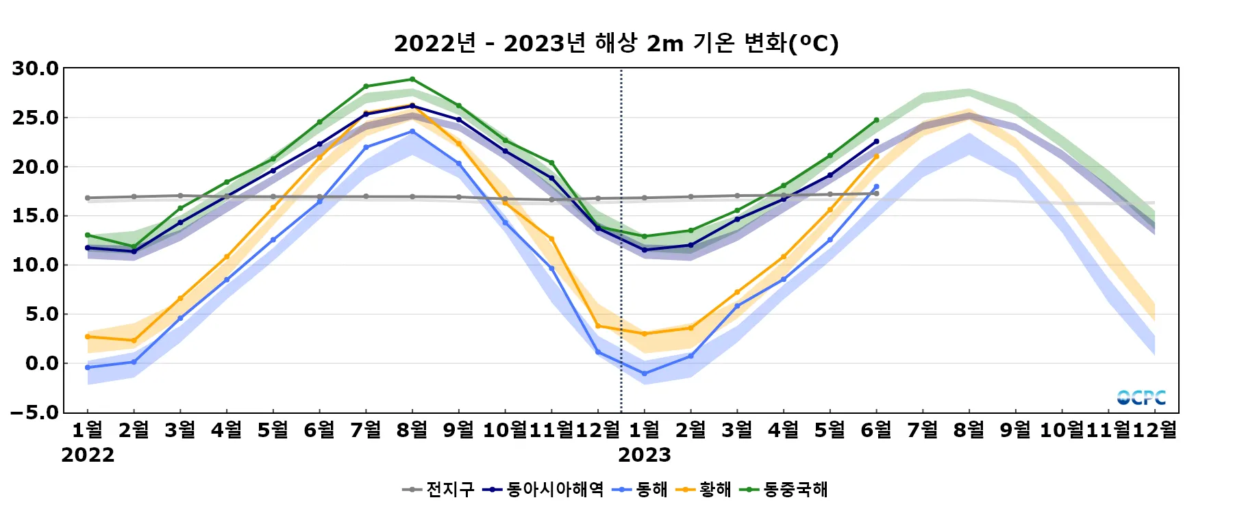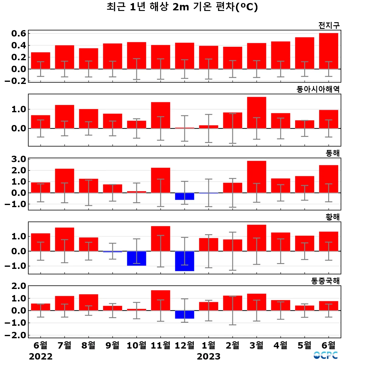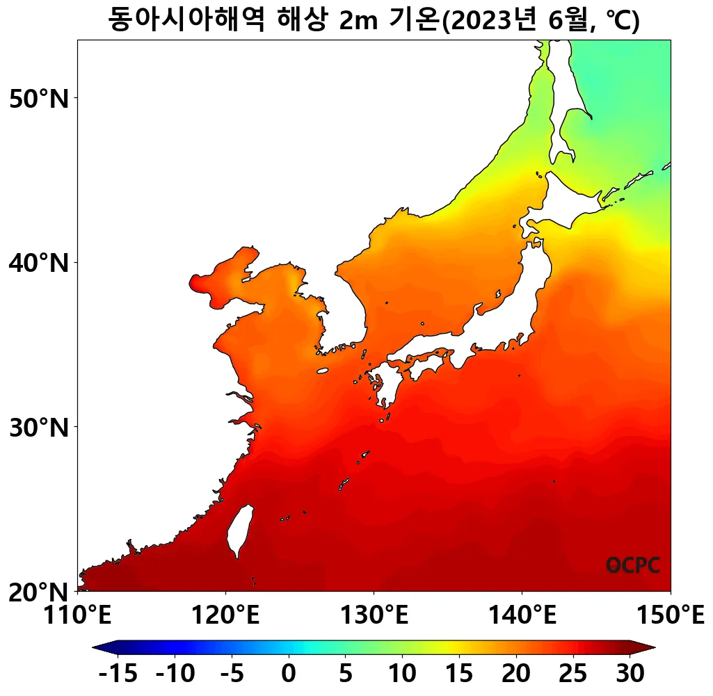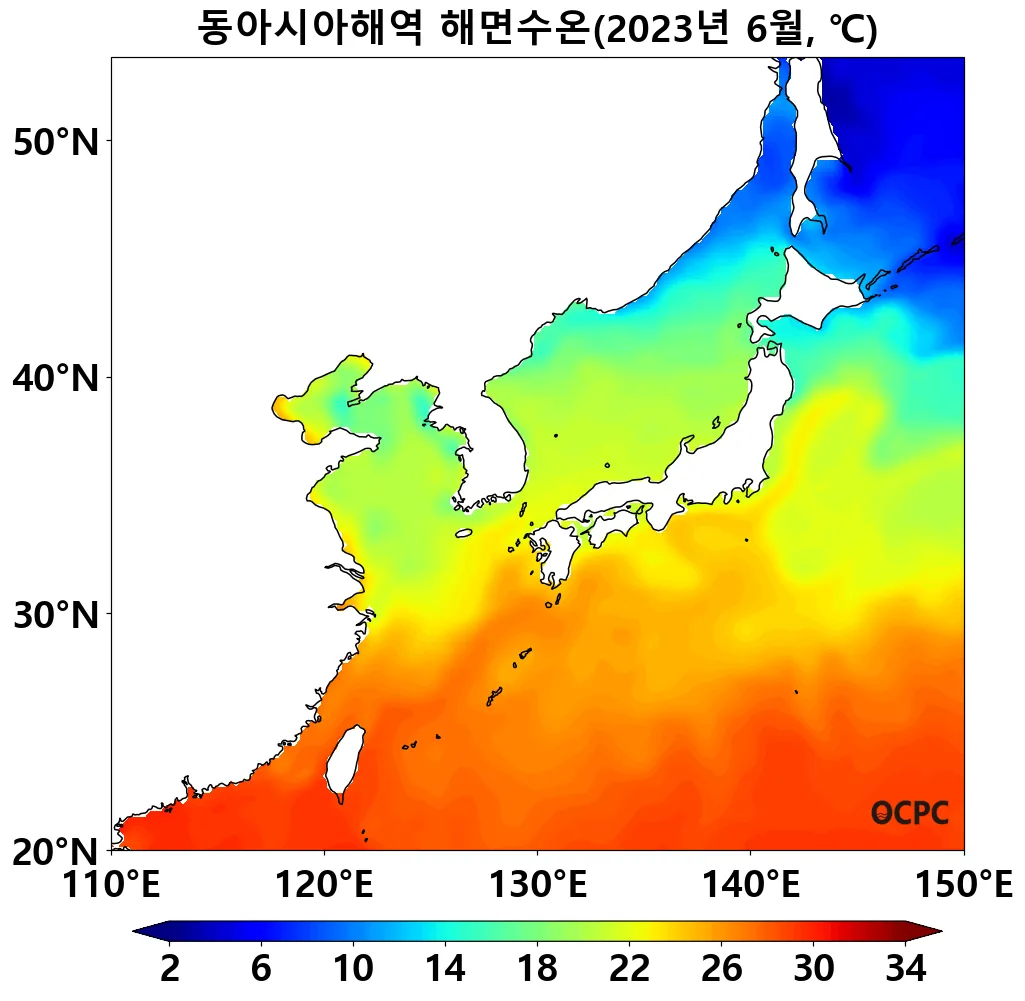 동해는 평년(15.1±0.6°C)보다 2.4°C 높아 1982~2023년(6월) 중 가장 높았으며, 황해는 평년(19.0±0.5°C)보다 0.8°C 높았고, 동중국해는 평년(24.0±0.5°C)보다 0.7°C 높았습니다.
