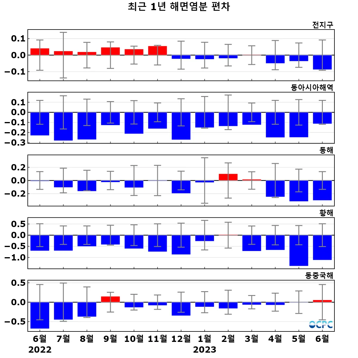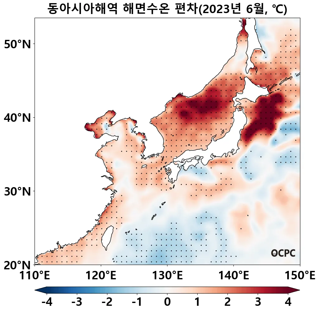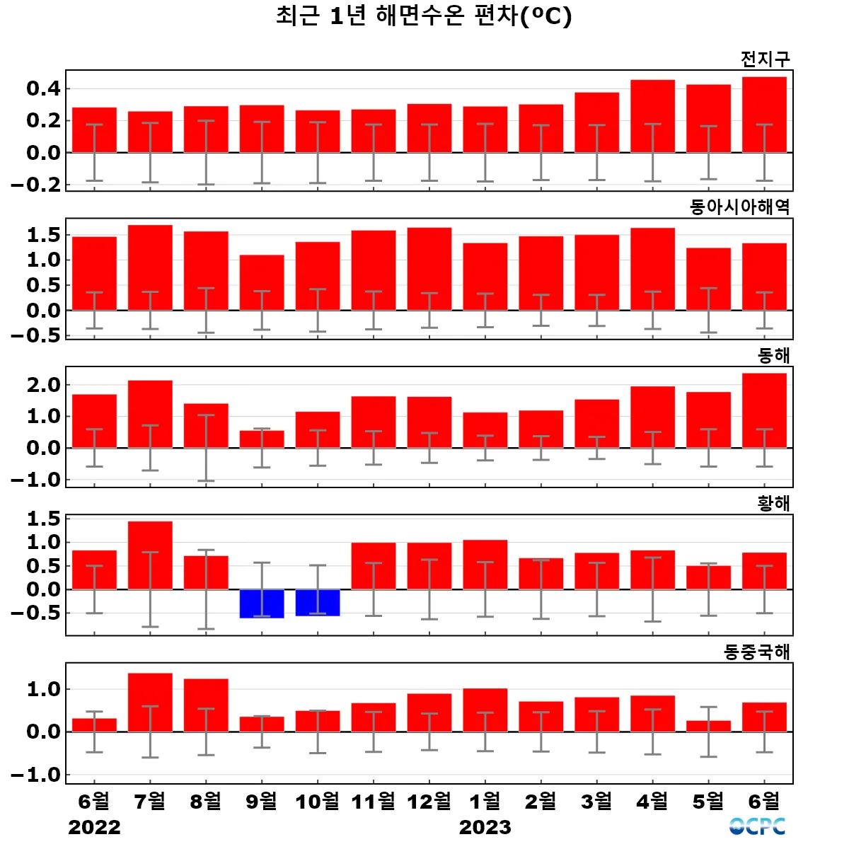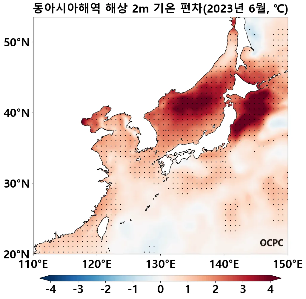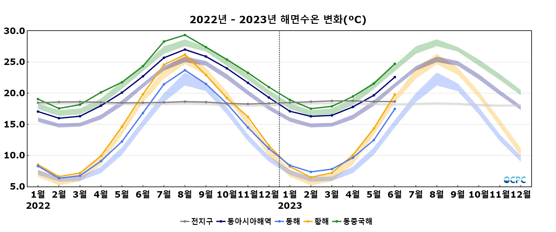 동해는 평년(15.1±0.6°C)보다 2.4°C 높아 1982~2023년(6월) 중 가장 높았으며, 황해는 평년(19.0±0.5°C)보다 0.8°C 높았고, 동중국해는 평년(24.0±0.5°C)보다 0.7°C 높았습니다.