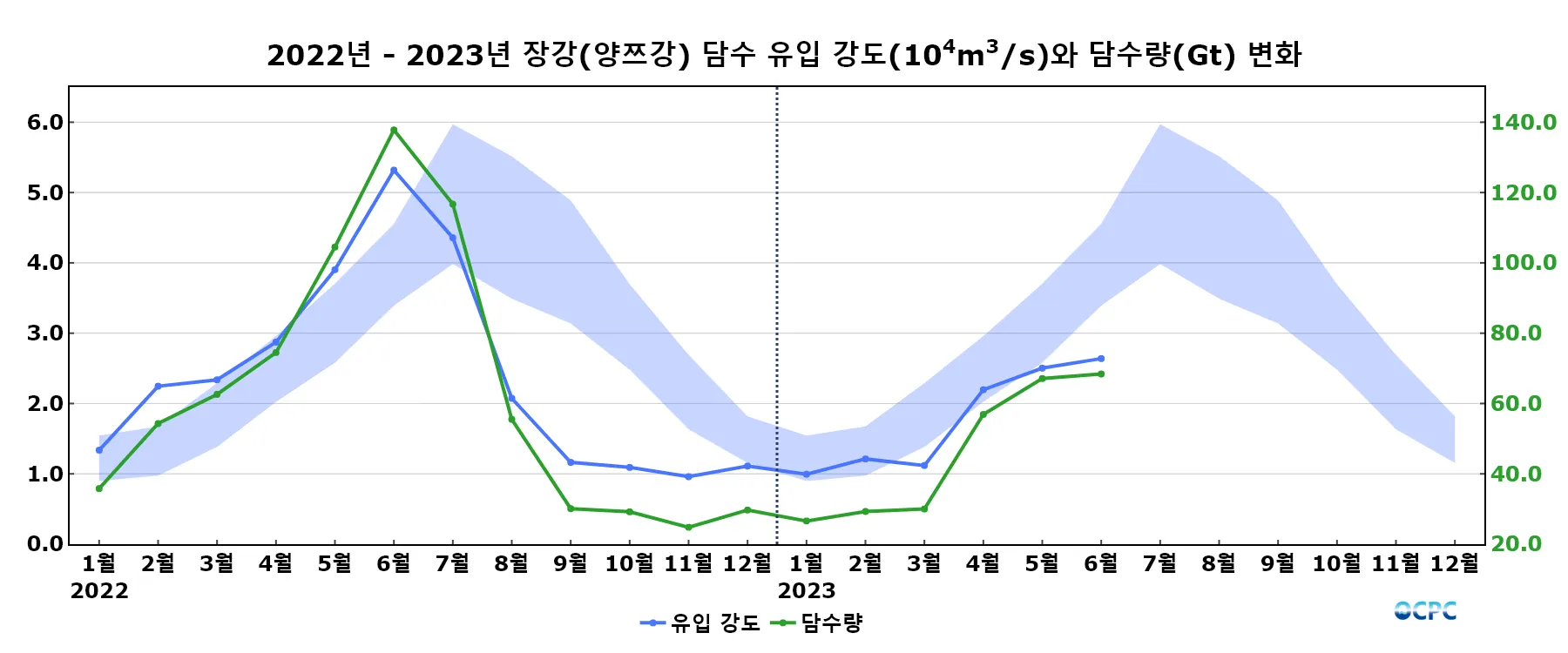 장강(양쯔강)으로부터의 담수 유입 강도는 초당 26,388.9톤으로 평년(초당 39,748.1±5,809.5톤)보다 33.6% 감소하여 1960~2023년(6월) 중 최소치를 기록했습니다.