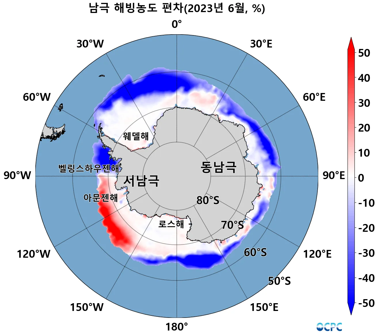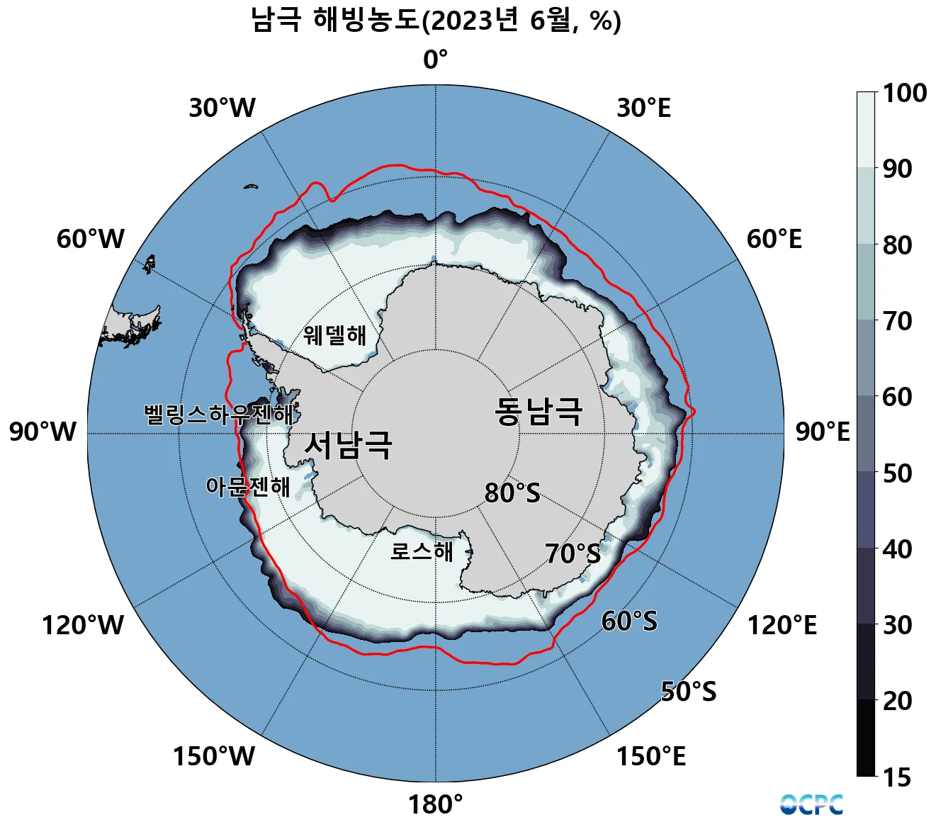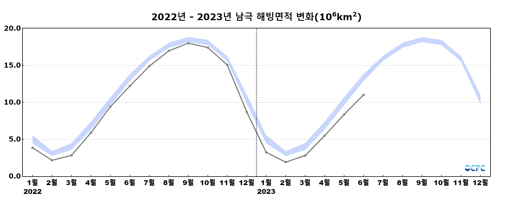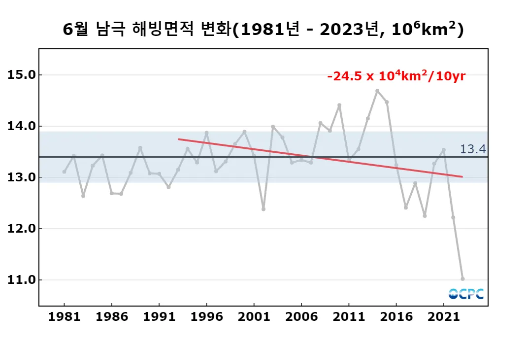 6월 남극 해빙면적은 1,102만km²로 평년(1,335만±47만km²)보다 233만km²(17.5%) 작았고 이는 자료기간(1981년 ~ 2023년) 중 가장 작은 값입니다.