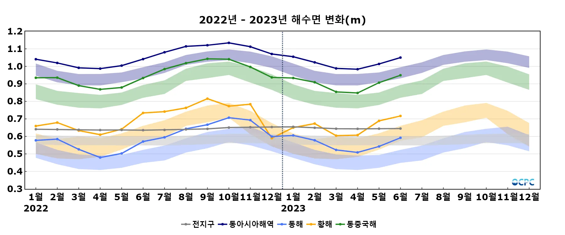 1993~2023년 동안 전지구 평균 6월 해수면은 10년에 3.4cm씩 상승하는 추세입니다. 동아시아해역은 10년에 3.7~4.0cm씩 상승하는 추세입니다.