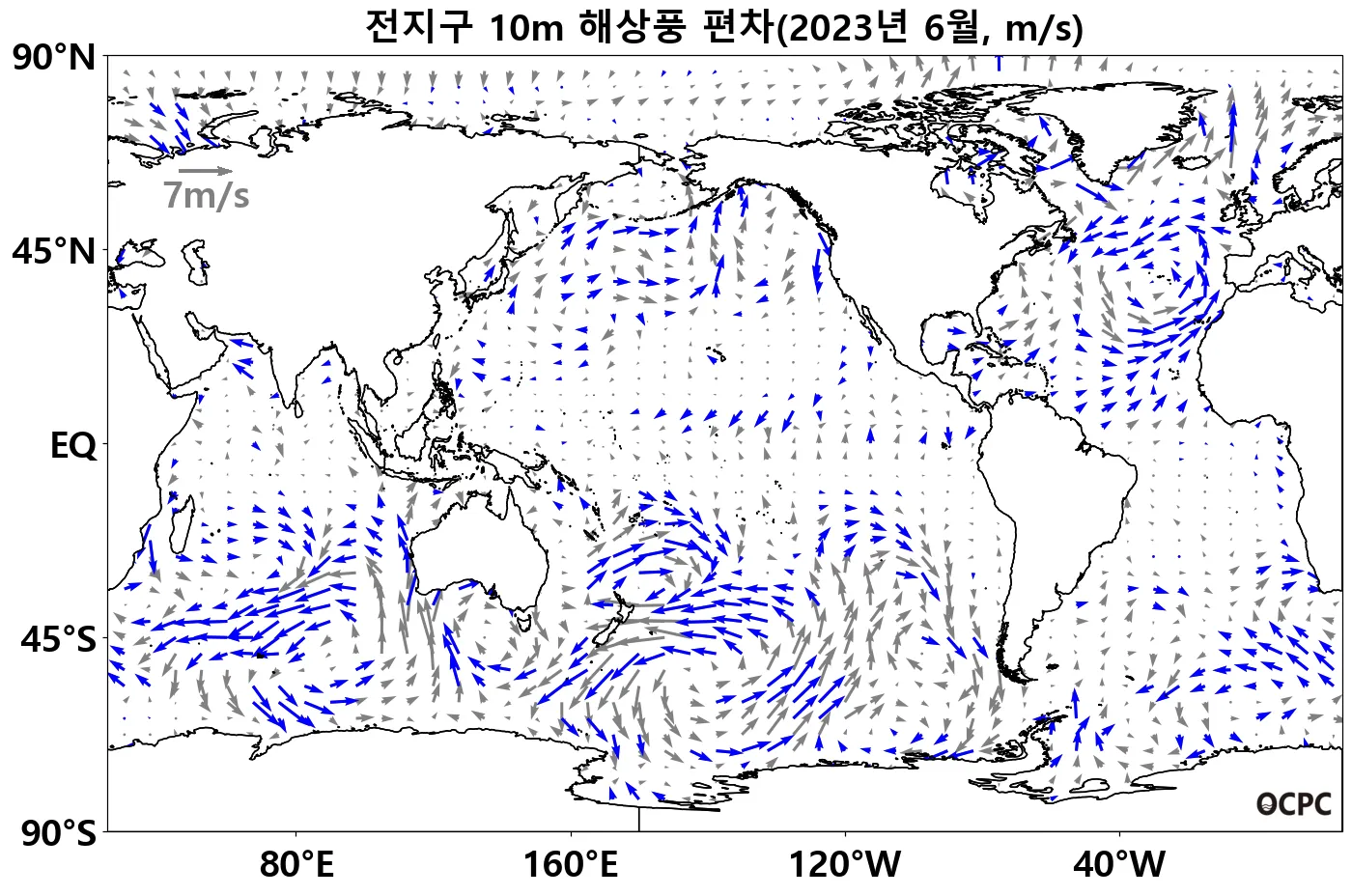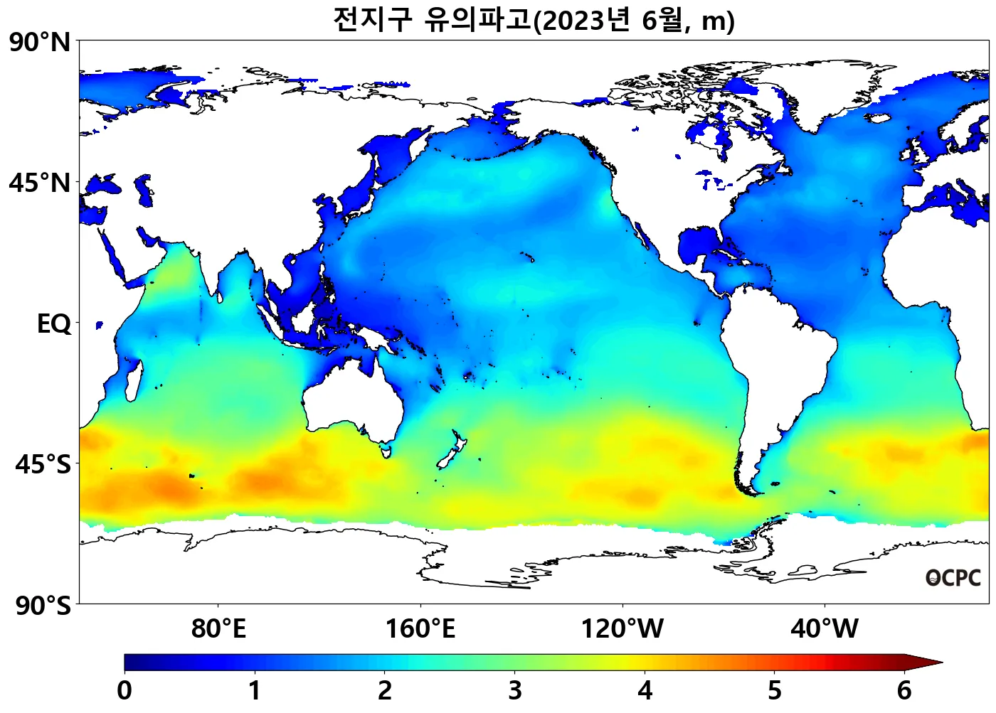 특히 북태평양 중위도 해역과 남태평양(160°E~160°W, 45~60°S), 열대 남동태평양(75~90°W, 0~15°S), 북대서양 중위도 해역(13~45°W, 45~60°N) 그리고 남인도양(50~100°E, 45~60°S)의 해면수온이 높았습니다.