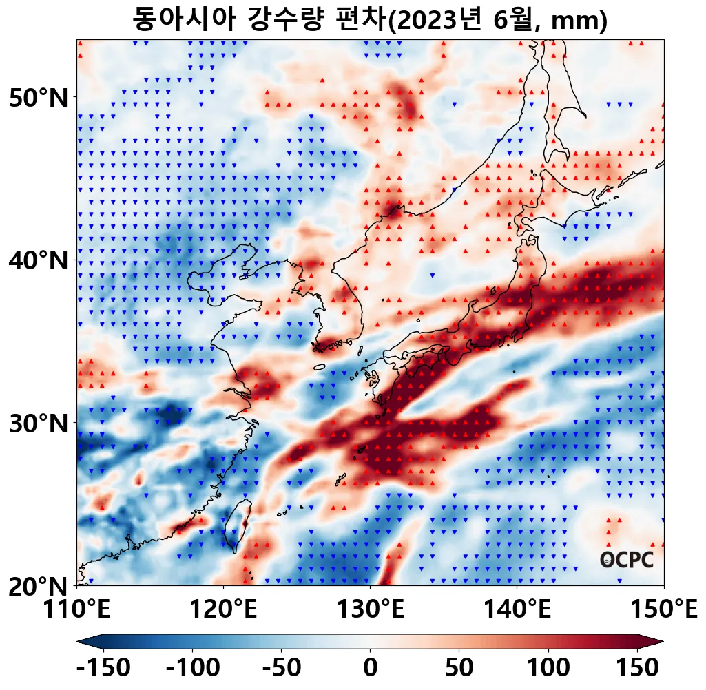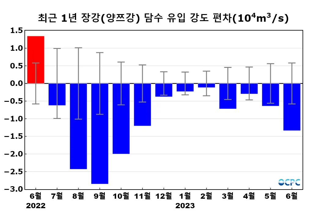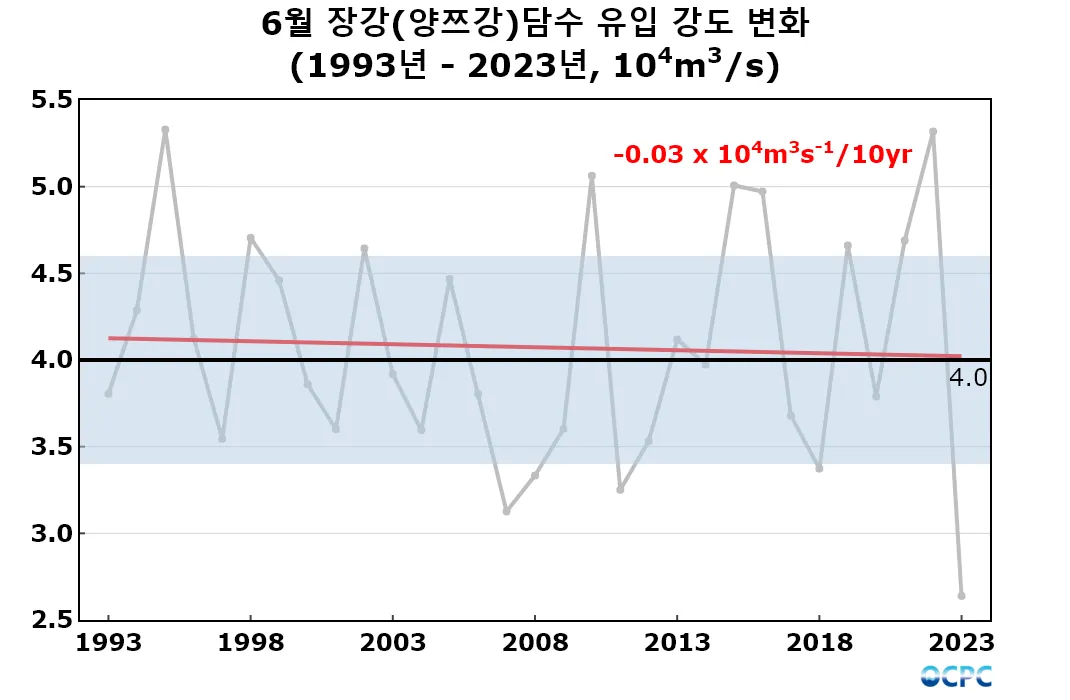 6월 한 달 동안 동중국해로 유입된 담수량으로 환산하면, 68.4기가톤(1Gt=10⁹m³=1km³)으로 평년103.0±15.1기가톤)보다 34.6기가톤 감소했습니다. 이는 중국 남부 장강 유역 강수량 감소로 인한 영향으로 추정됩니다.