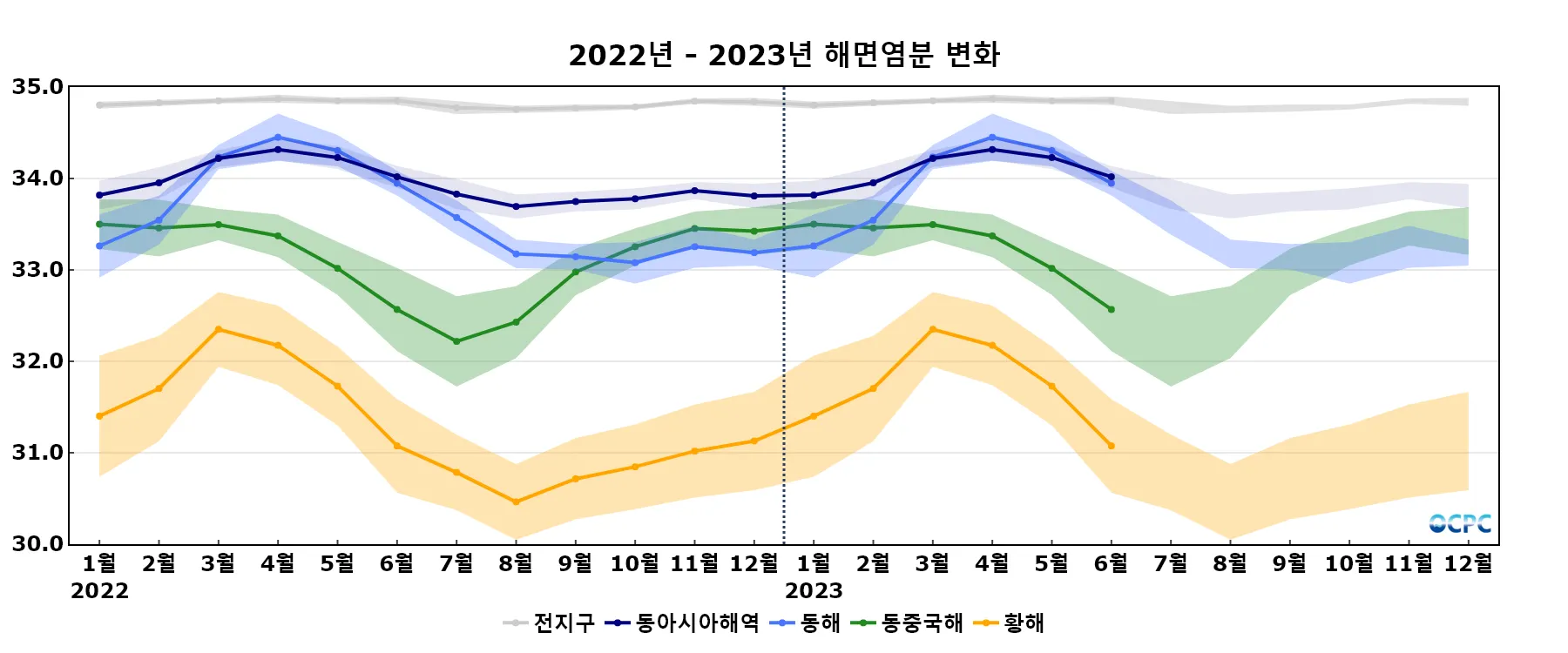 전지구 해면염분은 자료기간(2015년 ~ 2022년, 8년) 평균(34.85±0.05)과 비슷했습니다.