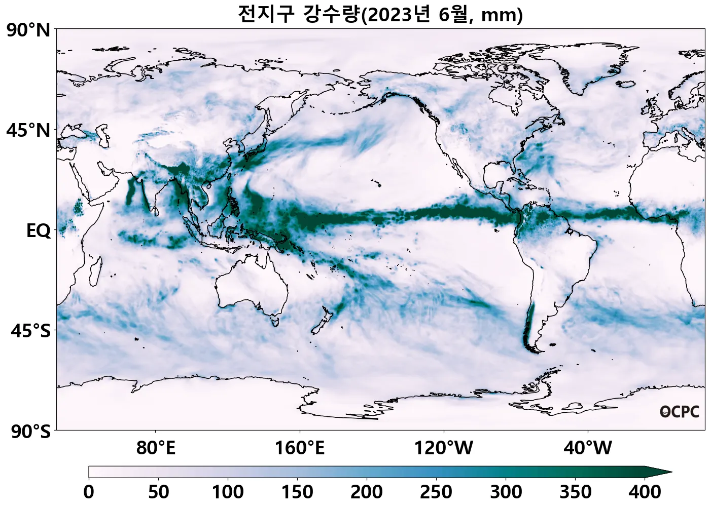 1993~2023년 동안 전지구 평균 6월 해상강수량은 10년에 1.4mm, 동아시아해역는 10년에 7.7mm 증가하는 추세입니다.