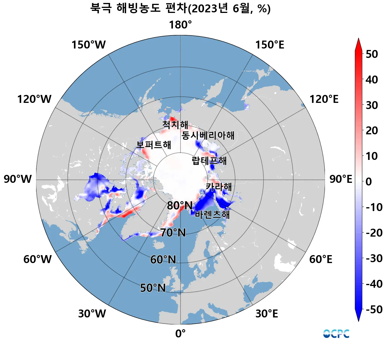 6월 북극 해빙면적은 1,096만km²로 평년(1,177만±47만km²)보다 81만km²(6.9%) 작았습니다.