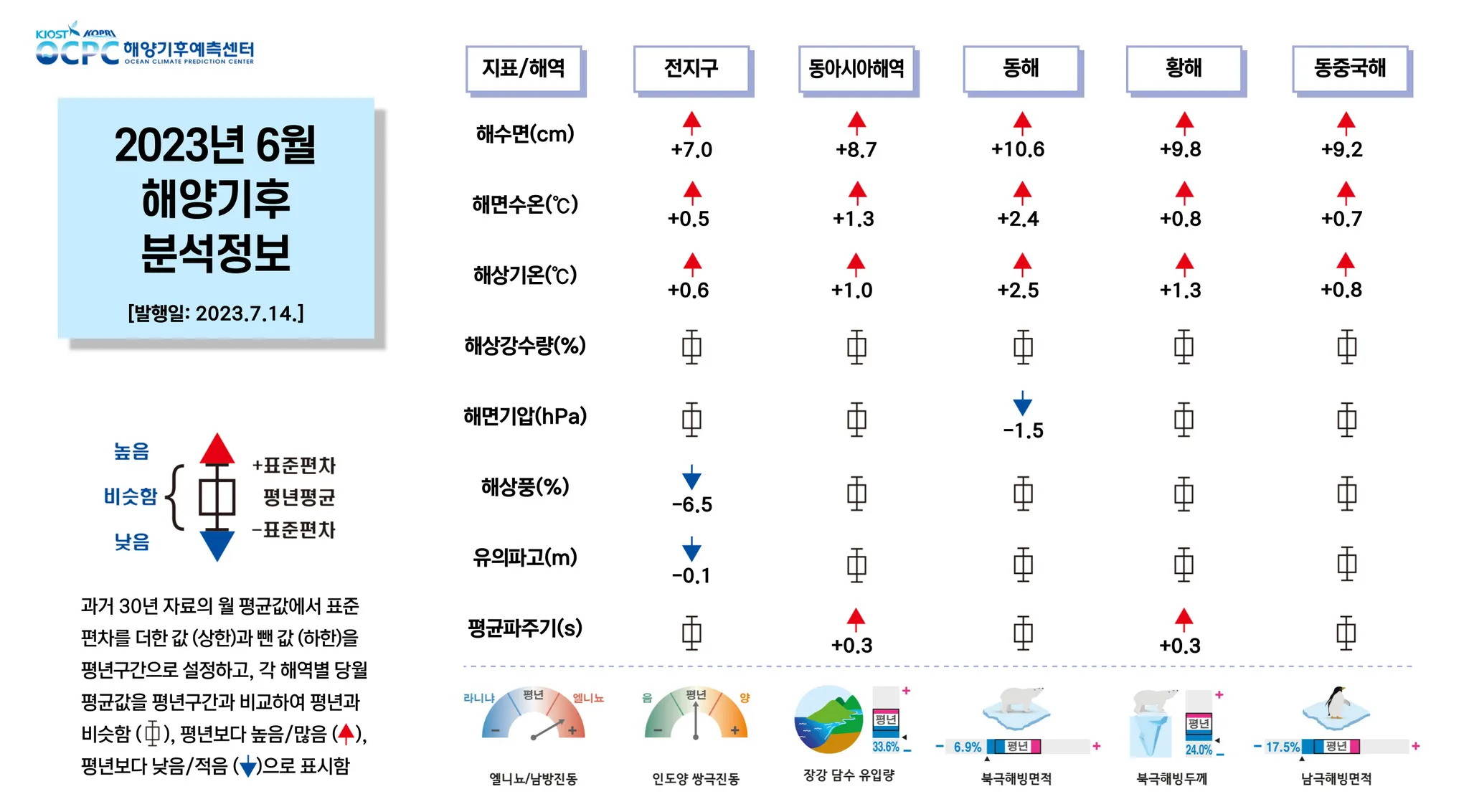 [해수면] 전지구(+7.0cm), 동아시아해역(+8.7cm), 동해(+10.6cm), 황해(+9.8cm), 동중국해(+9.2cm)는 평년보다 높았습니다. 전지구, 동아시아해역, 동해, 동중국해 해수면은 1993~2023년(6월) 중 가장 높았습니다.