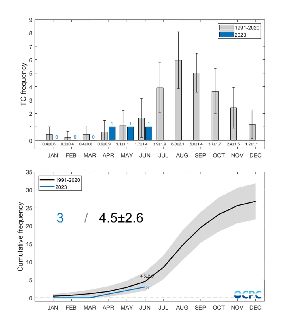 2023년 월별 태풍 발생수 (위) 및 누적 발생수 (아래)