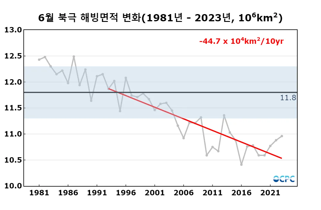 1993~2023년 동안 6월 북극 해빙면적은 10년에 44.7만km²씩 감소하는 추세입니다.