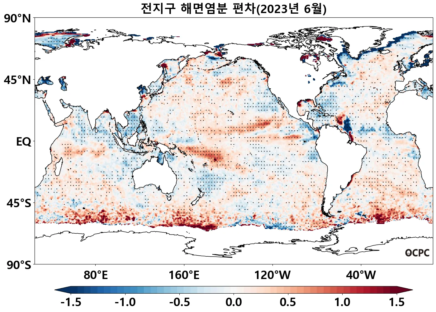 인공위성(SMAP)을 이용한 해면염분 추정 자료는 2015년 4월부터 활용가능하나 기간이 짧고 다른 자료에 비해서 불확실성이 큽니다. 2023년부터는 8년 정도의 자료가 확보되는 시점이어서 기간 평균 대비 월별 편차를 시범적으로 제공하오니 참고하시기 바랍니다.